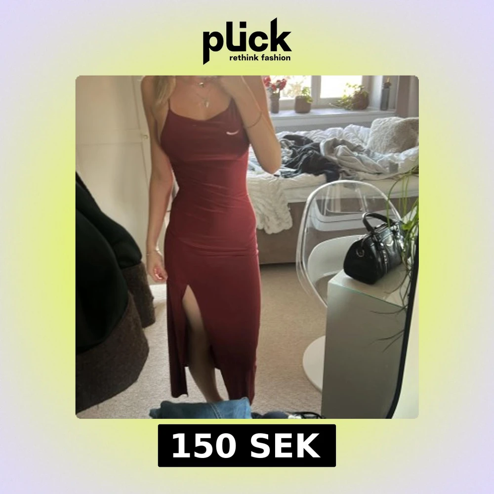 Snygg vinröd långklänning med smala axelband och en elegant slits på sidan. Perfekt för en kväll ute eller en speciell tillställning. Klänningen har en tight passform som framhäver figuren.