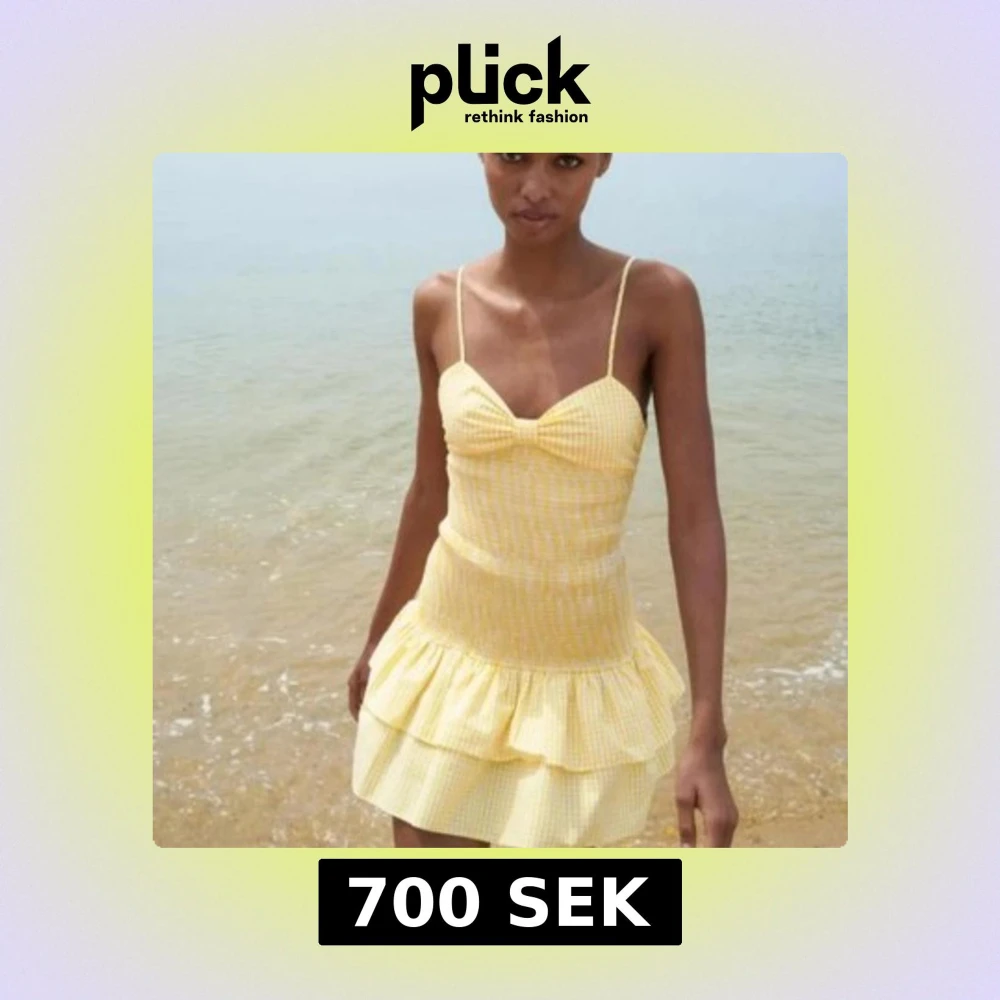 Charmig gul klänning med rutigt mönster och smala axelband. Klänningen har volangdetaljer och en söt rosett i ryggen. Perfekt för soliga dagar vid stranden. Ny med lapp. Öppen för prisförslag. TROR INTE ATT DEN ÄR FRÅN ZARA, köpte den här på Plick.