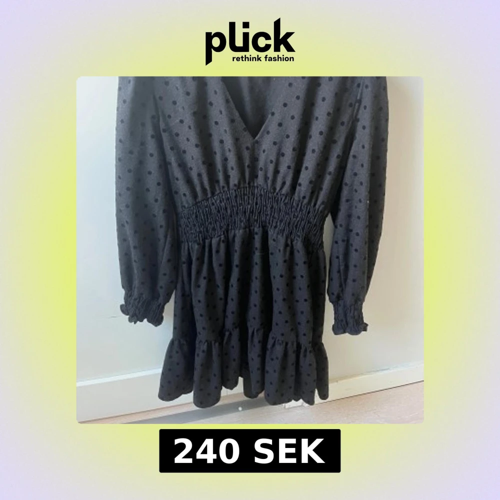 Supersöt svart kortklänning från Zara med prickigt mönster, v-ringning och smock i midjan. Klänningen har långa ärmar med resår vid ärmslut och volang nertill. Perfekt för dig som gillar en lekfull och trendig stil.