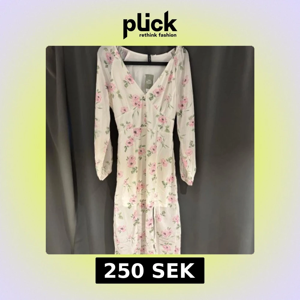 Vit långklänning med rosa blommor och gröna blad. Klänningen har långa ärmar med resår vid handlederna och markerad midja. Perfekt för sommarens alla tillfällen. Från H&M i storlek S, säljer då den tyvärr var för liten. Helt oanvänd med prislapp kvar! 😁