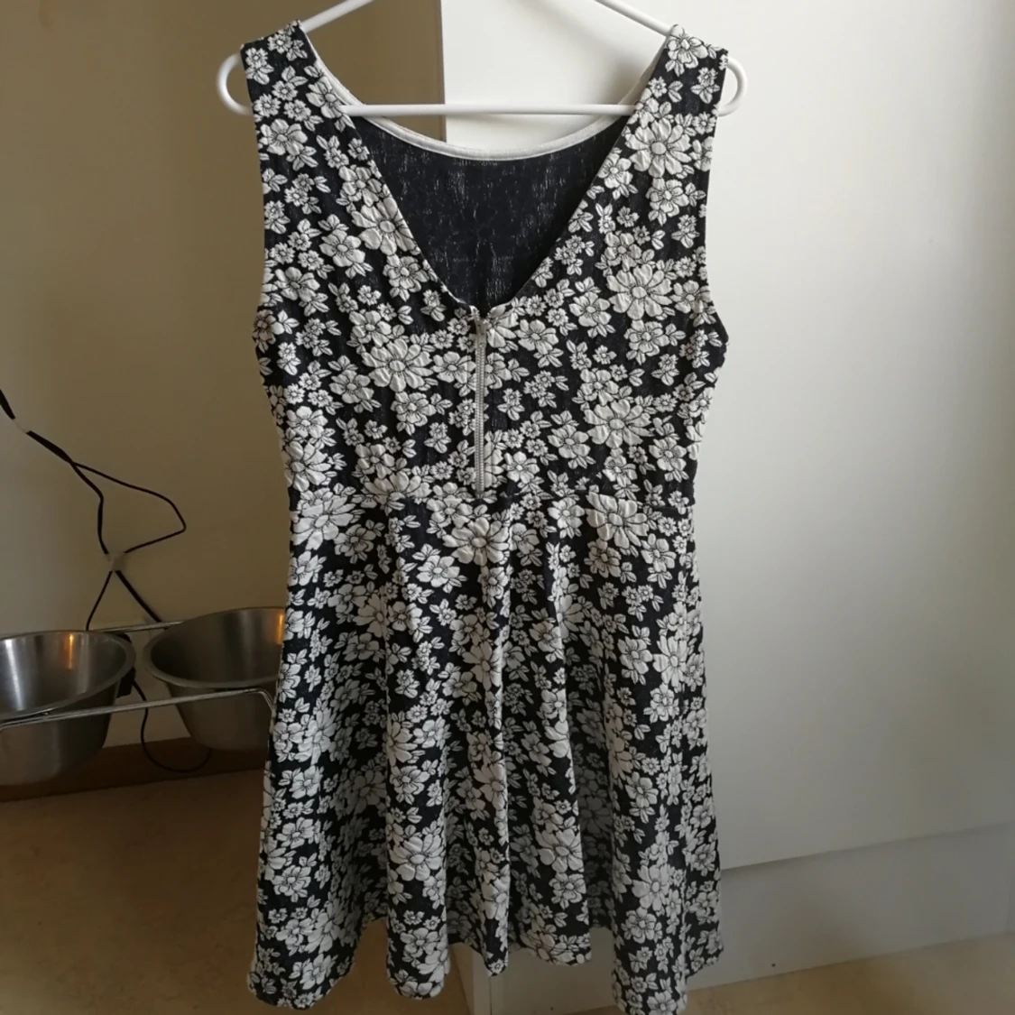 Blommig klänning med dragkedja i ryggen. Stretchig.
