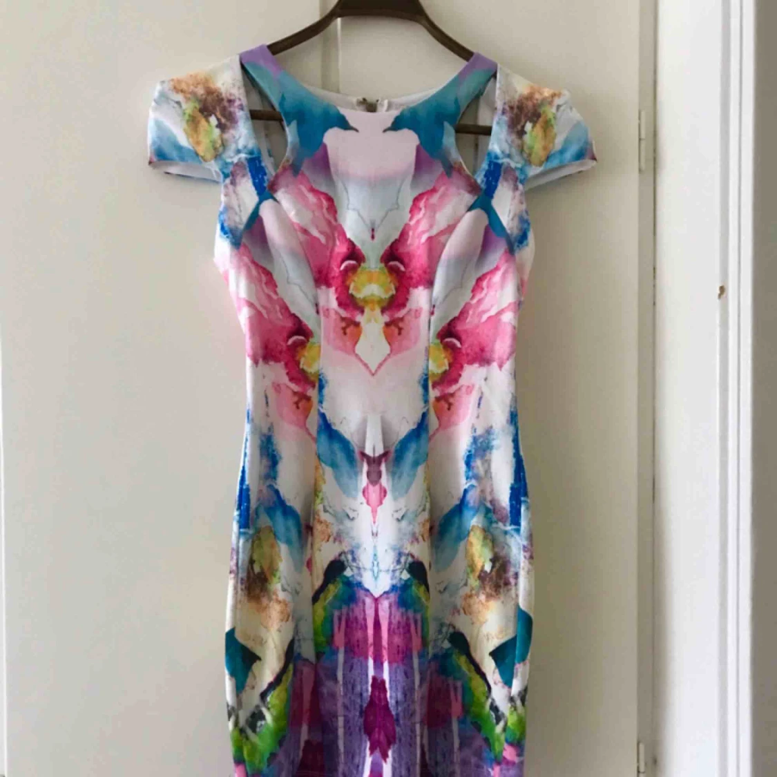 Färgglad klänning från Ginger Fizz i storlek XS. Kedja baktill och korta ärmar. Perfekt till fest.