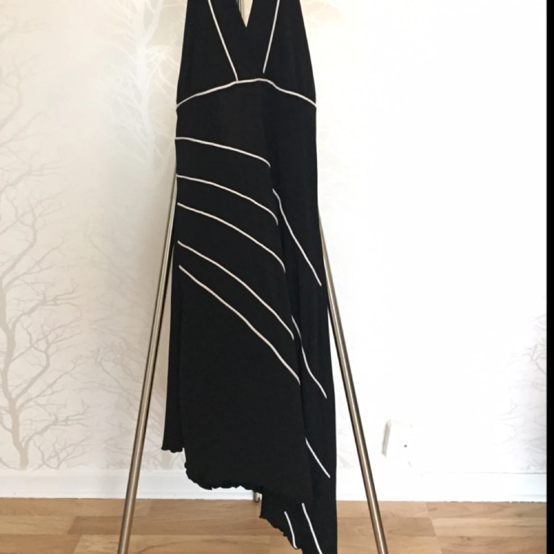 Svart klänning med vita ränder och ojämnt slut vid knäna. Superskön och elastisk så passar de flesta kroppsformer. Endast använd ett fåtal gånger. Tar endast swish eller kontant.