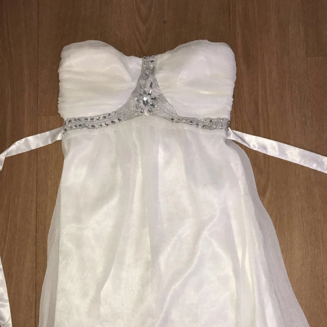En kort vit klänning med silver detaljer vid bröstet