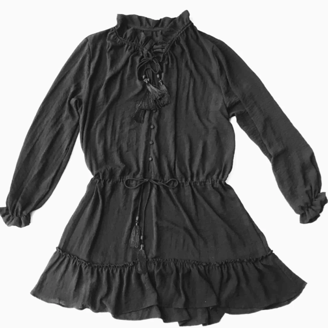 Klänning från H&M. Använd 2-3 gånger. Svart med knytning i halsen och midjan. Reglerbar knytning kring midjan. Mycket gott skick. 120kr