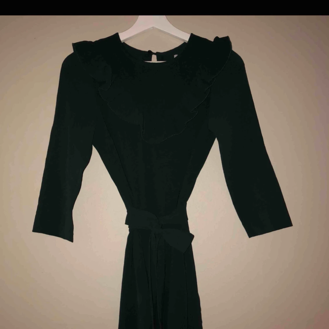Super fin mörkgrön klänning med volang vid halsen och band i midjan! Oanvänd