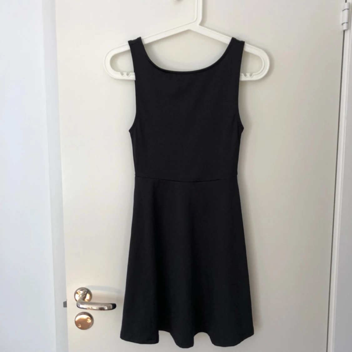 Svart klänning i elastiskt ”bikini-tyg” från H&M, med djup V-ringning i ryggen. Supersnygg modell, med åtsittande på överkropp ner till midjan och därefter vippig nedtill. Använd en gång.