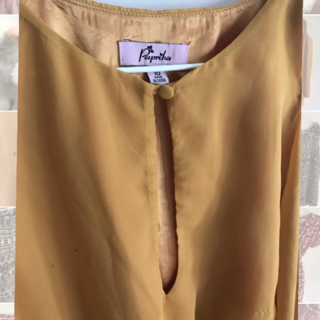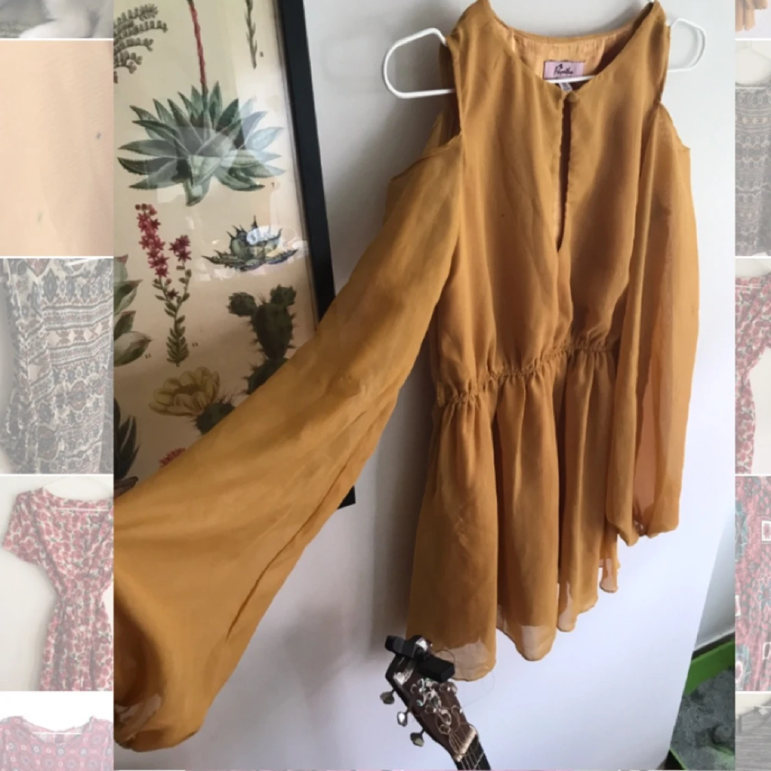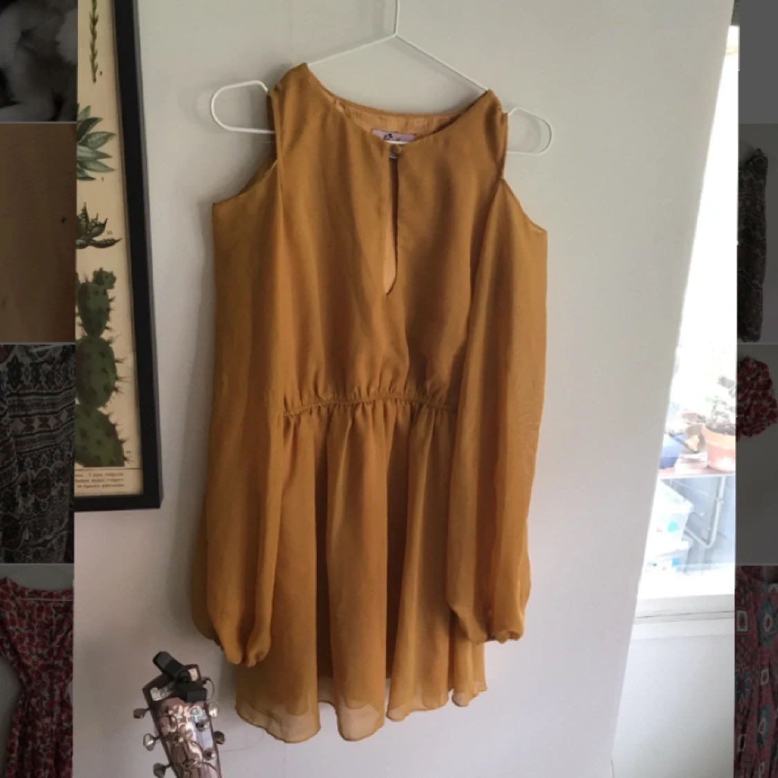 Senapsgul klänning köpt på Nelly.se. Sparsamt använd men har dock 2 små fläckar (se bild 3) som kan gå bort i tvätten. Materialet är chiffong med en glansig underkjol. Hällor för skärp finns :) kan mötas upp i Uppsala, annars betalar köparen frakten.
