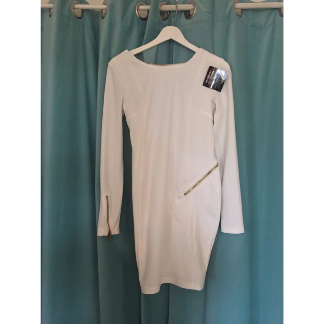 Snygg vit Rebecca Stella klänning strl M. Dragkedja som går att ändra som man vill. Aldrig använd med prislapp kvar. Köparen betalar frakt.