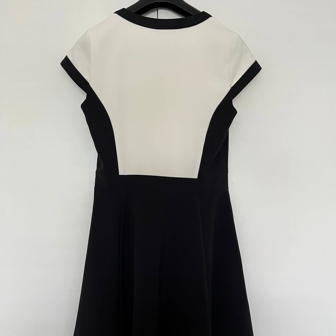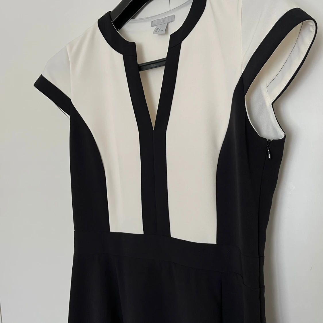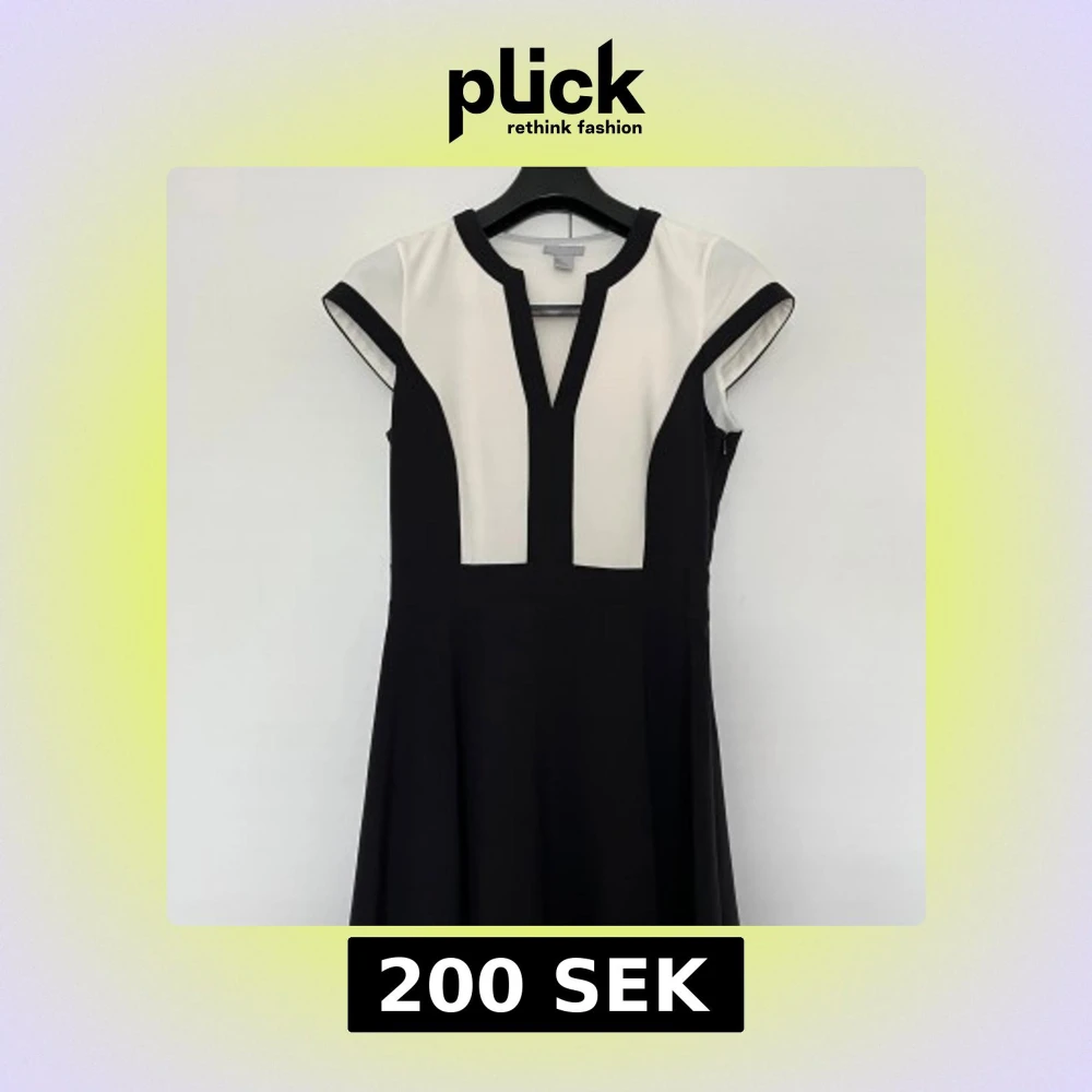 Elegant svart och vit klänning med en unik design från H&M i storlek 40. Klänningen har korta ärmar och en figursmickrande silhuett. Perfekt för både vardag och fest. Tjock material i 93% polyester och 7% elastan samt fodret i 100% polyester. Stängning med diskret dragkedja på vänster sida. Nyskick. Mått: Längd ca 95 cm Byst ca 43 cm Midja ca 38 cm Ärmlängd mätt från axeln ca 10 cm Axel till axel ca 37 cm
