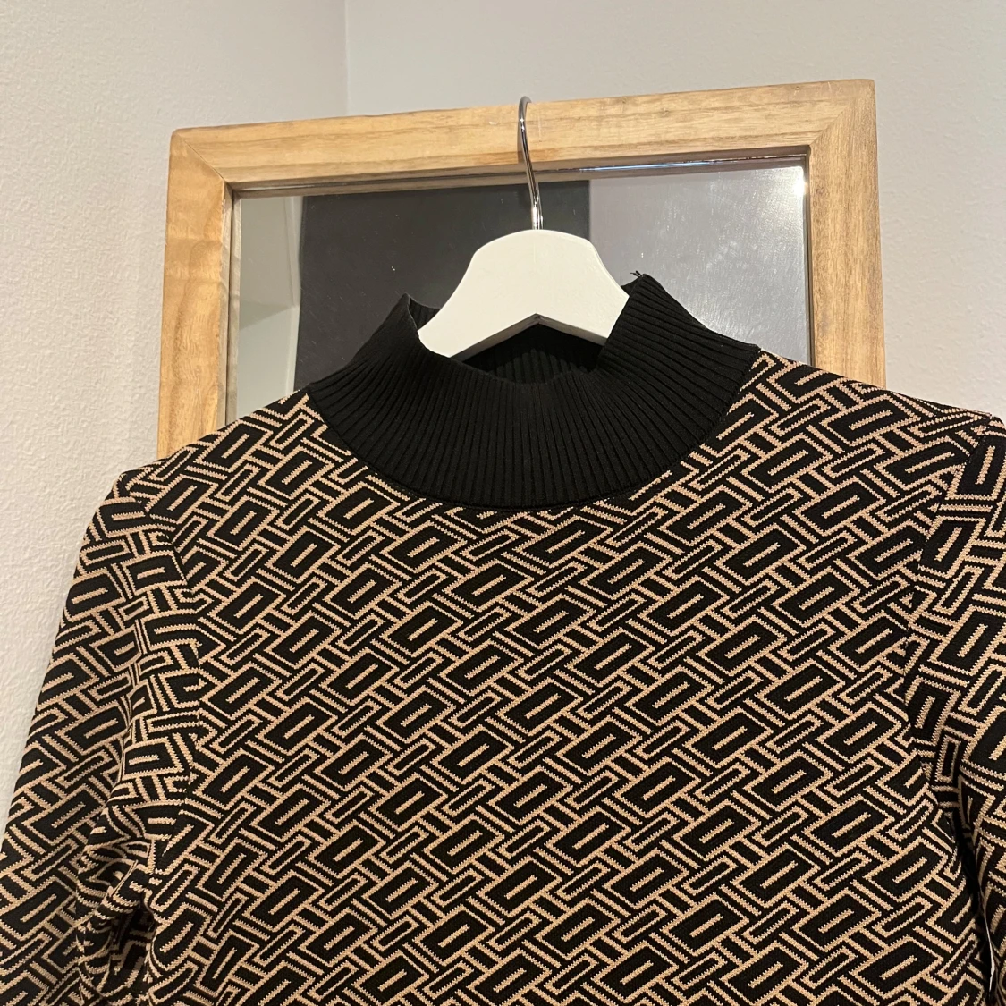 Snygg långklänning med geometriskt mönster i svart och beige. Klänningen har en hög ribbad krage och långa ärmar. Materialet känns mjukt och bekvämt. Klänningen är ifrån Chiquelle och är i strl S/M. Använd fåtal gånger men är som ny✨