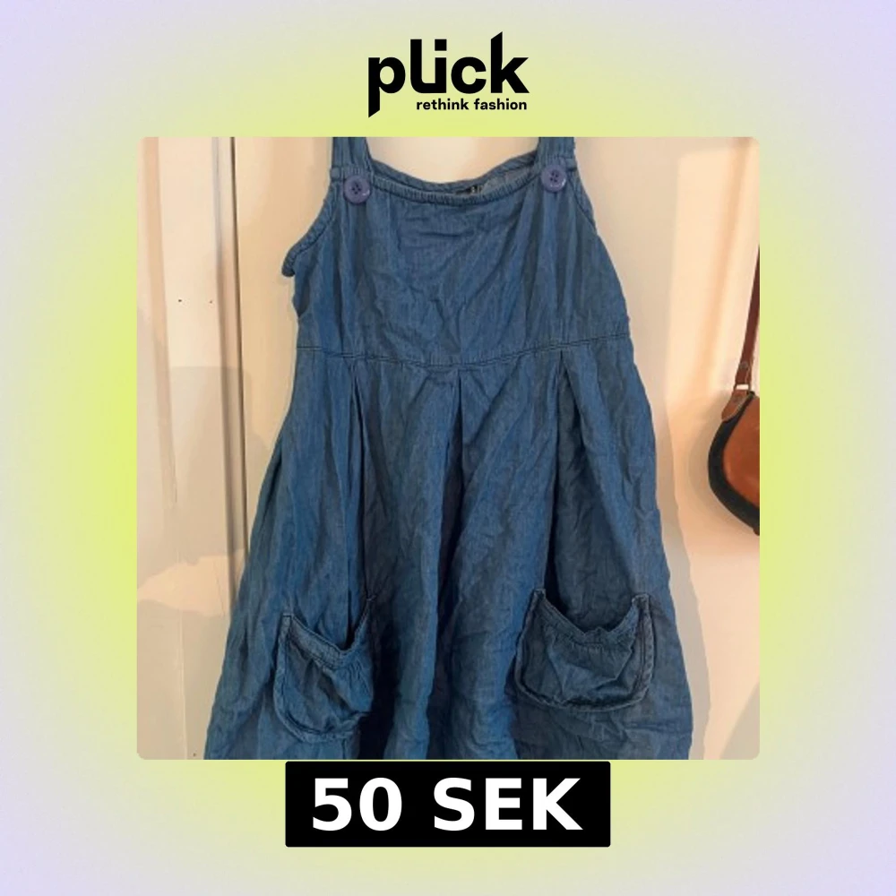 Blå jeansklänning med axelband och två fickor framtill.