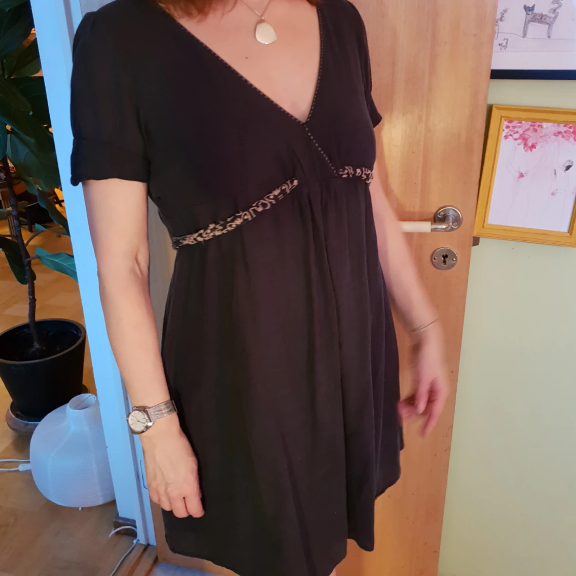 En söt, kort klänning med djup urringning från det gamla, exklusiva märket Brittinger. Klänningen har ett slags textilskärp som knyts. Tillverkad av en blandning av viskos och bomull. I gott skick. Går att hämtas upp i Gamla Stan eller skickas med post.
