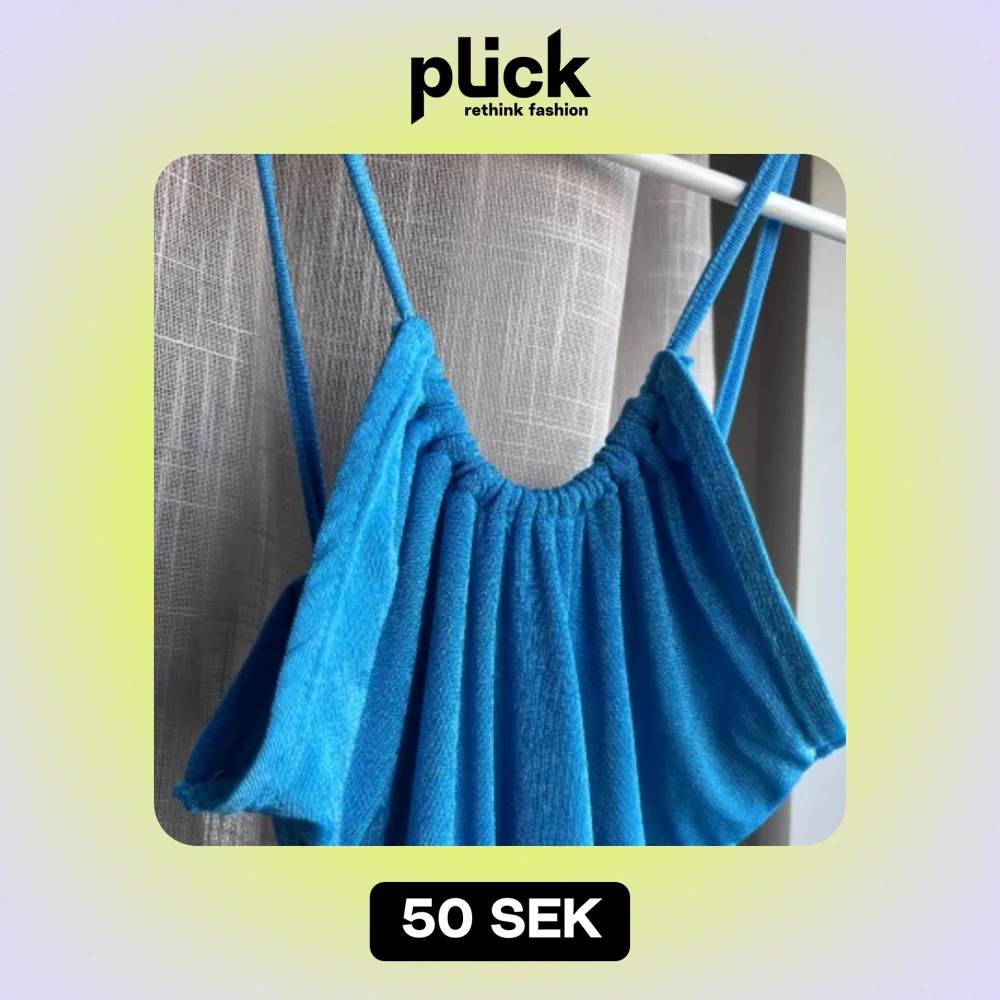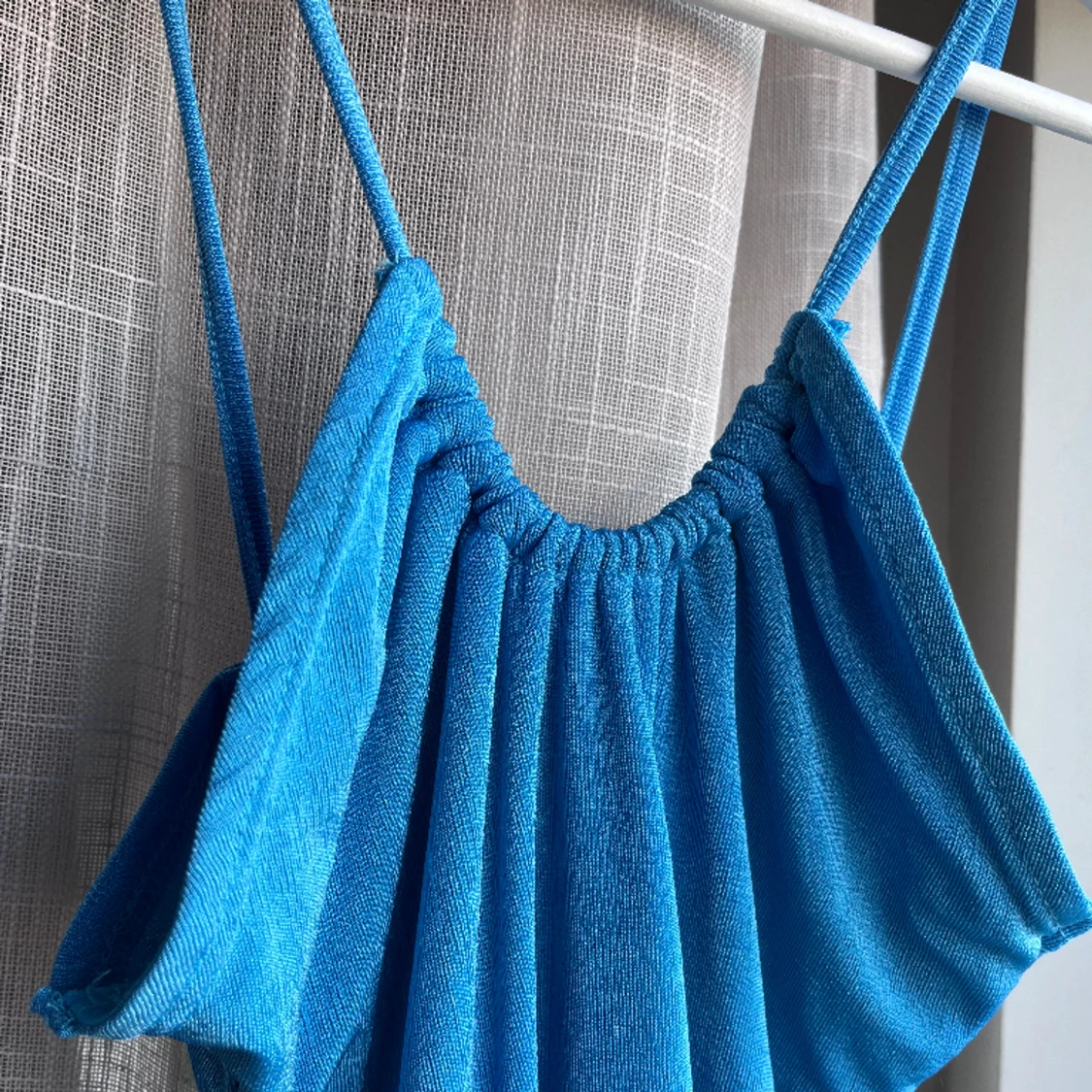 Liten festlig klänning i en härlig blå färg. Säljer då den inte kommer till användning. Väldigt stretchig och smickrande passform. Knyts i ryggen, och går att ha banden på olika sätt framtill🫶🏼skriv gärna till mig ifall du har frågor🤍
