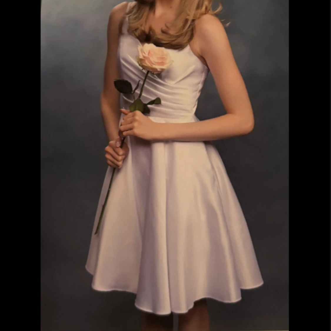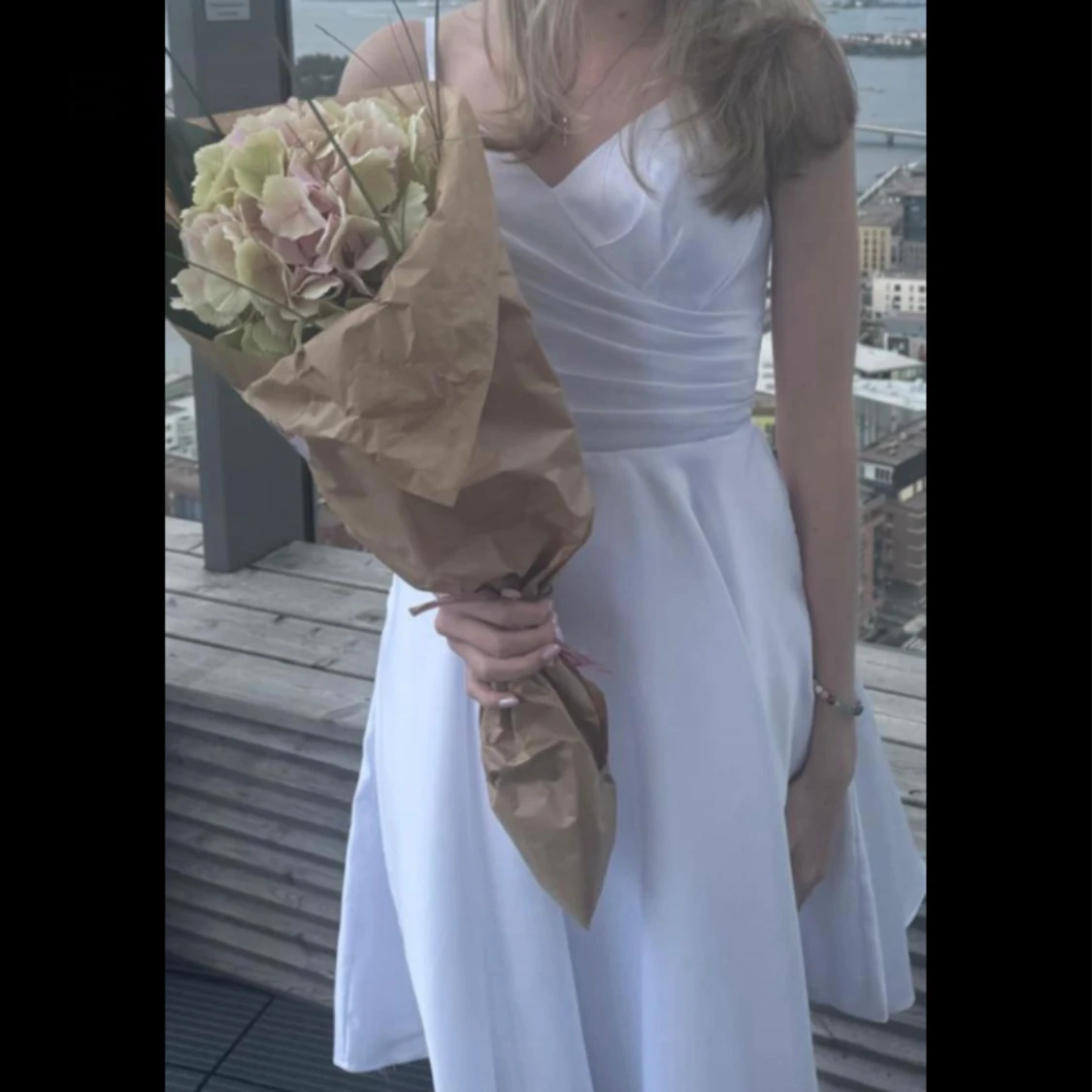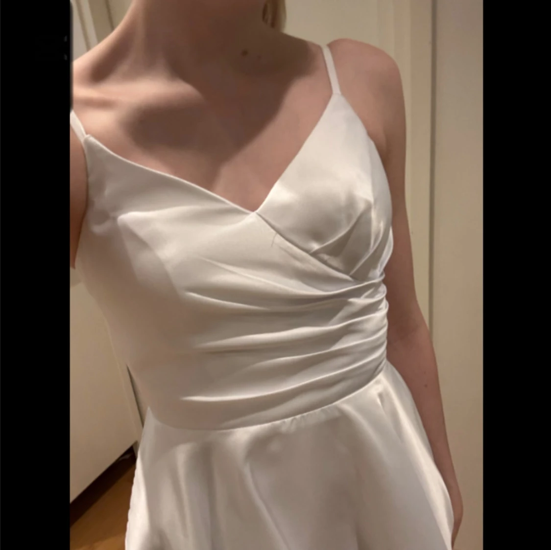 Superfin vit kortklänning i satinliknade material med omlottdetalj över bysten och smala axelband. Klänningen har v-ringning och markerad midja, samt en lätt utställd kjol som ger en flowy känsla. Dragkedja i ryggen för enkel påklädning. Använd en kom, nytt skick, inga fel. Köpt från White Dress Stockmann (Helsingfors, Finland). Original pris: 280€ (3 070kr)