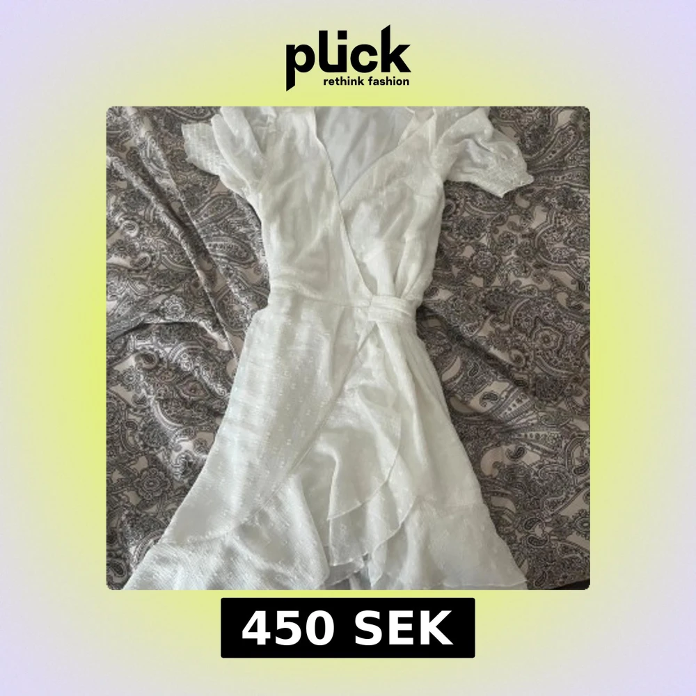 Säljer en söt vit omlottklänning med korta ärmar och volangdetaljer. Klänningen har en knytning i midjan och ett diskret prickigt mönster. Perfekt till konfirmation! Använd endast en gång så den är i nytt skick. Köpt förra året för 699kr.