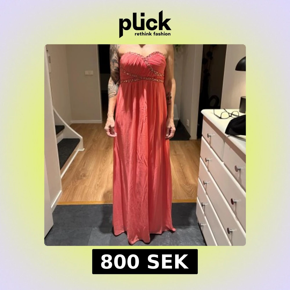 Säljer en vacker korallfärgad axelbandslös klänning. Klänningen har snygga strass detaljer med en smickrande passform. Har enbart använt klänningen 1 gång! Perfekt för balen, bröllopet, sittningen, finmiddagen osv! Pris kan diskuteras!💞