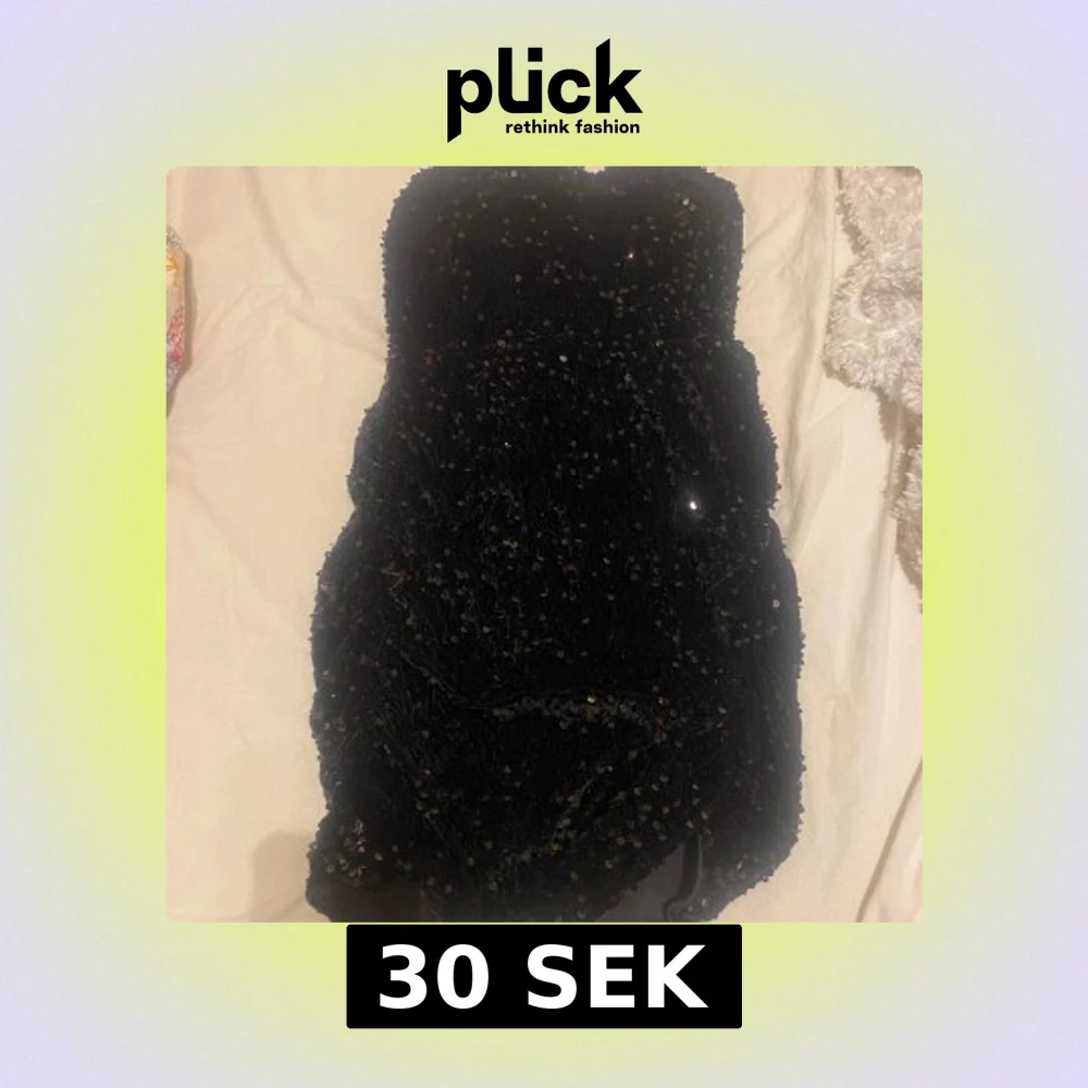 Snygg svart klänning med paljetter, den har inga axelband. Rätt stor i storleken men kort