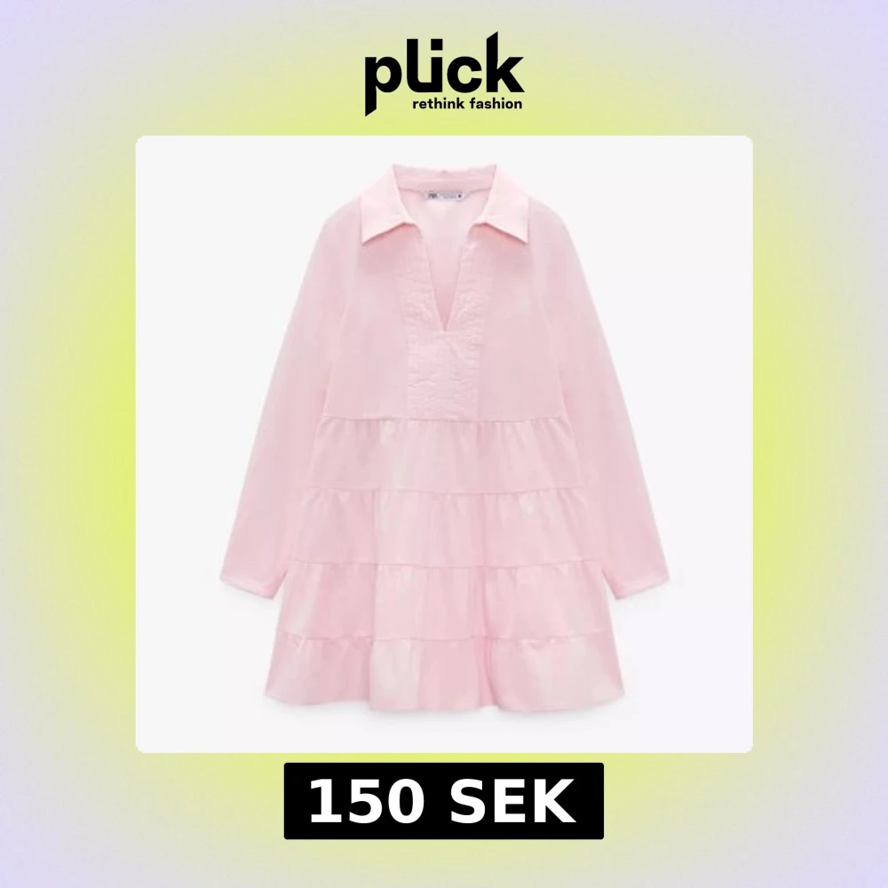 Säljer en söt ljusrosa klänning från Zara med volanger och v-ringad krage. Klänningen har långa ärmar och en avslappnad passform, perfekt för vår och sommar. Köpt för 379kr. (Fråga efter egna bilder)