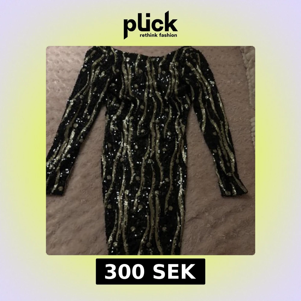 Snygg svart klänning med guldiga paljetter i ett vågigt mönster. Klänningen har långa ärmar och en figurnära passform, perfekt för en festlig kväll som t.ex nyår eller Julafton.. Den glittriga designen ger en lyxig känsla. Den är från Soky & soka, pris kan diskuteras 😁