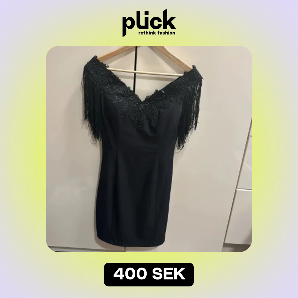 Säljer denna jätte fina korta och tajta svarta fest klänning med fransar och spets sitter som en 36, klänningen har gått sönder lite där bak vid spetsen så pris går att diskutera vid snabb affär!
