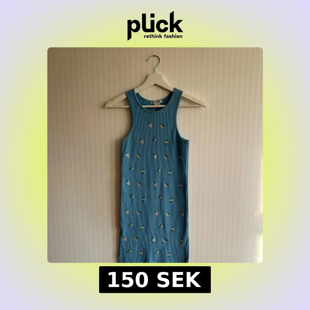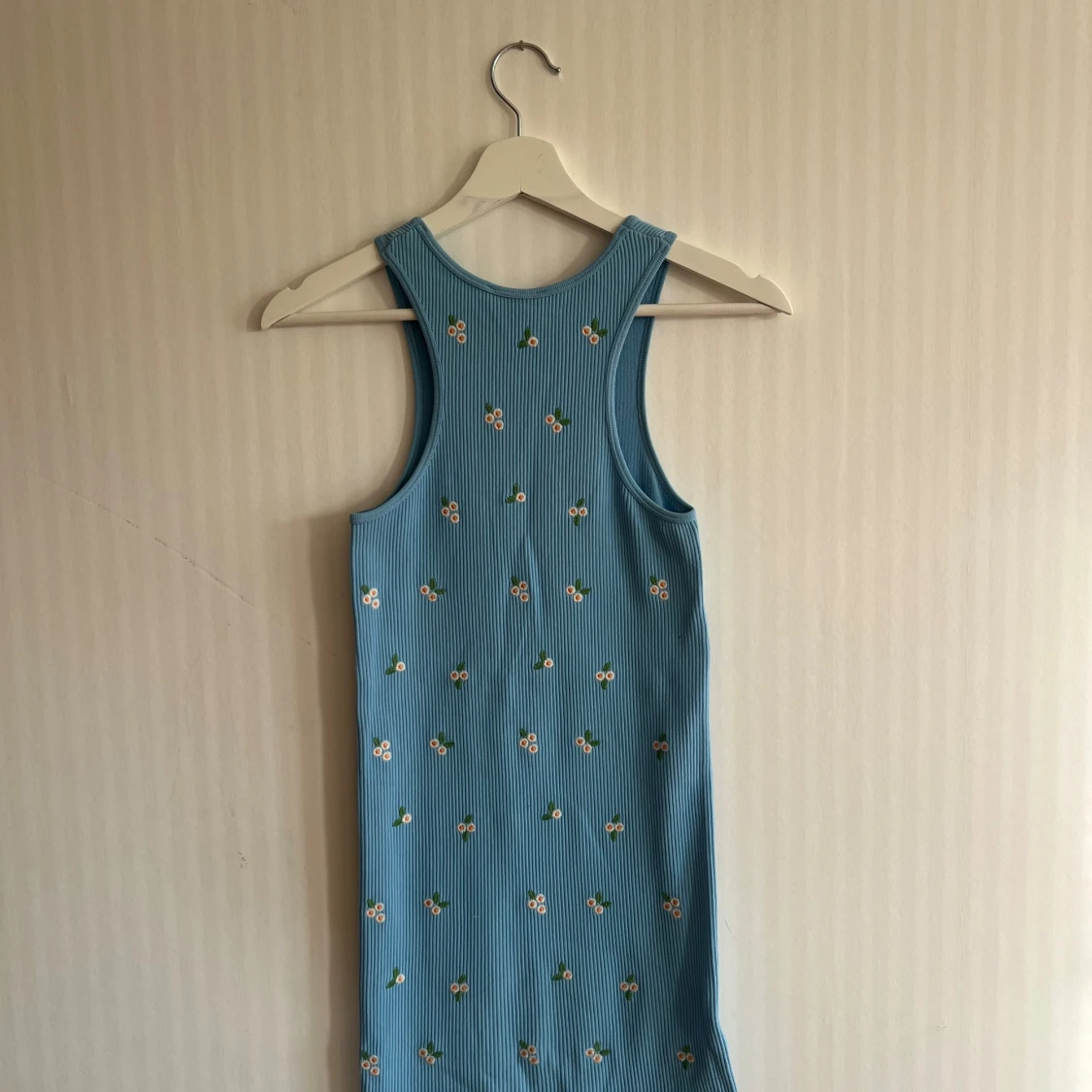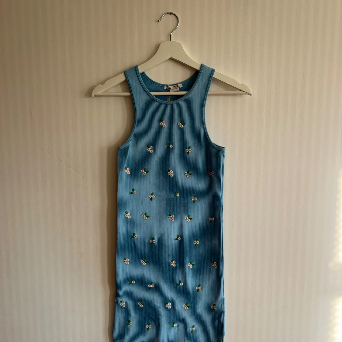 Blå ribbad sommarklänning med små broderade blommor över hela. Strl S. Från Zara.