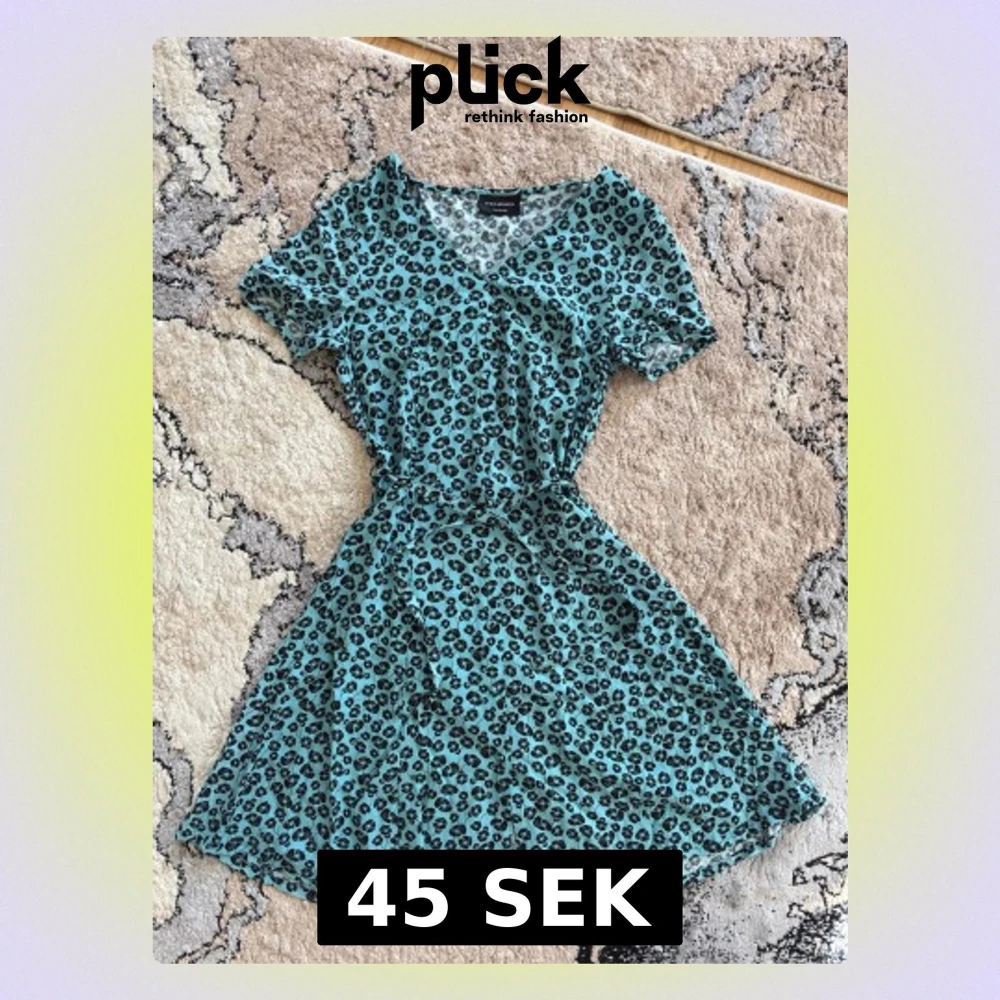 Kortklänning i turkos med svart leopardmönster. Klänningen har omlott framtill, korta ärmar och markerad midja för en smickrande siluett. Tillverkad i ett mjukt och lätt material som passar perfekt för varmare dagar. Anledning till att jag säljer är på grund av den är inte min stil längre.