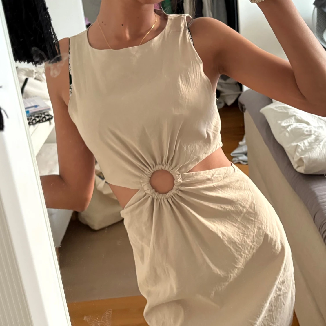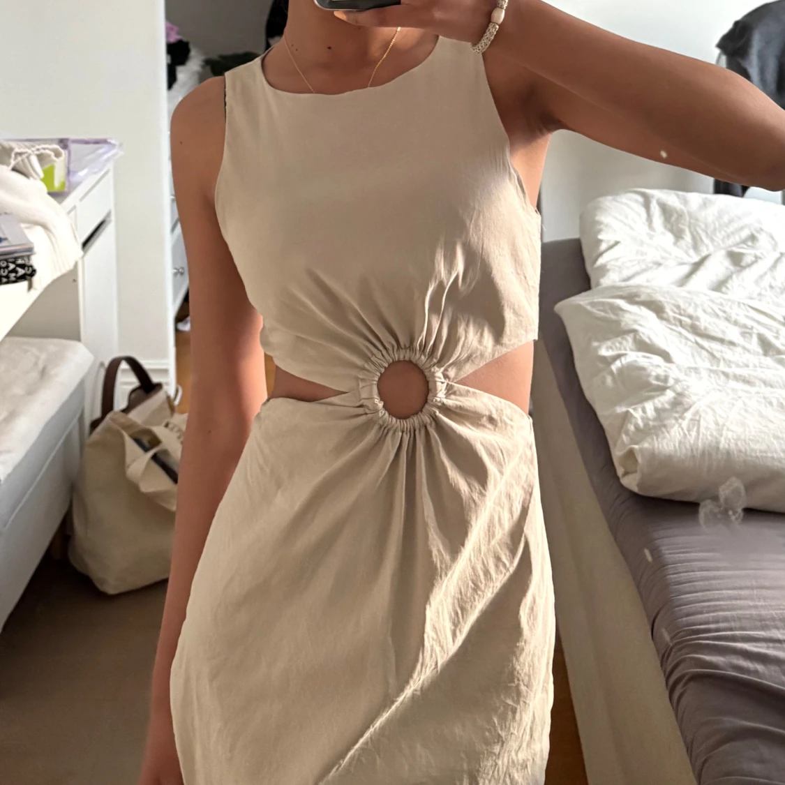 Trendig beige kortklänning med rund ringdetalj och cut-out i midjan☺️☺️