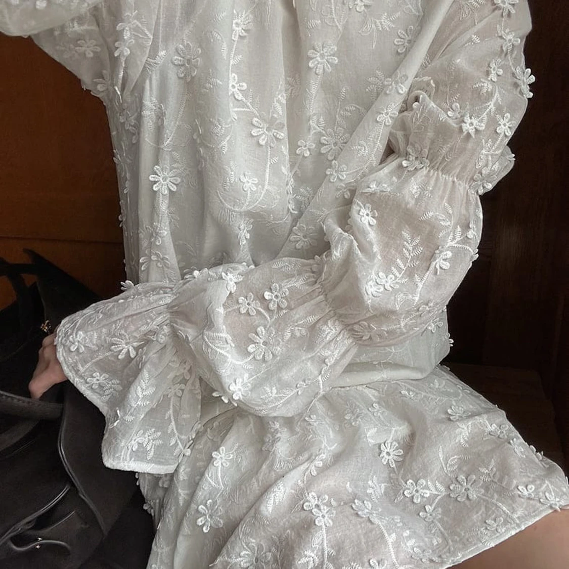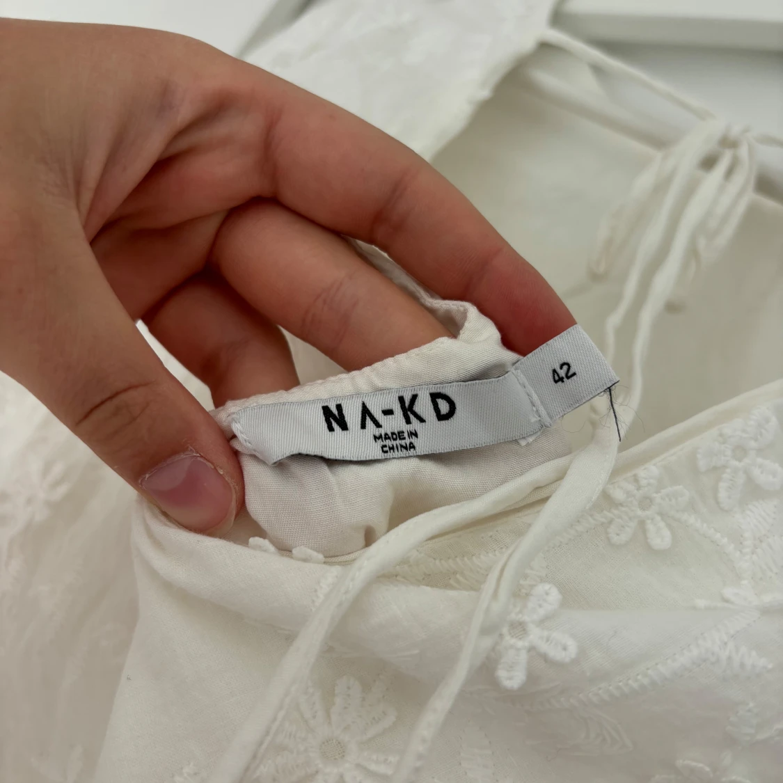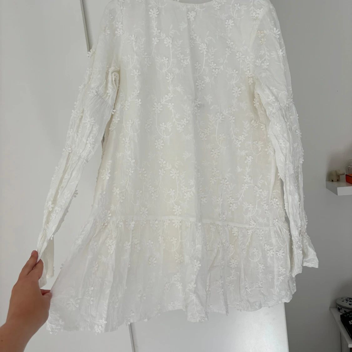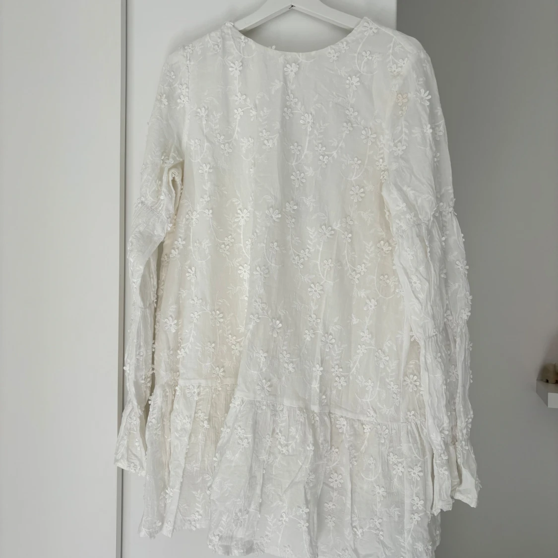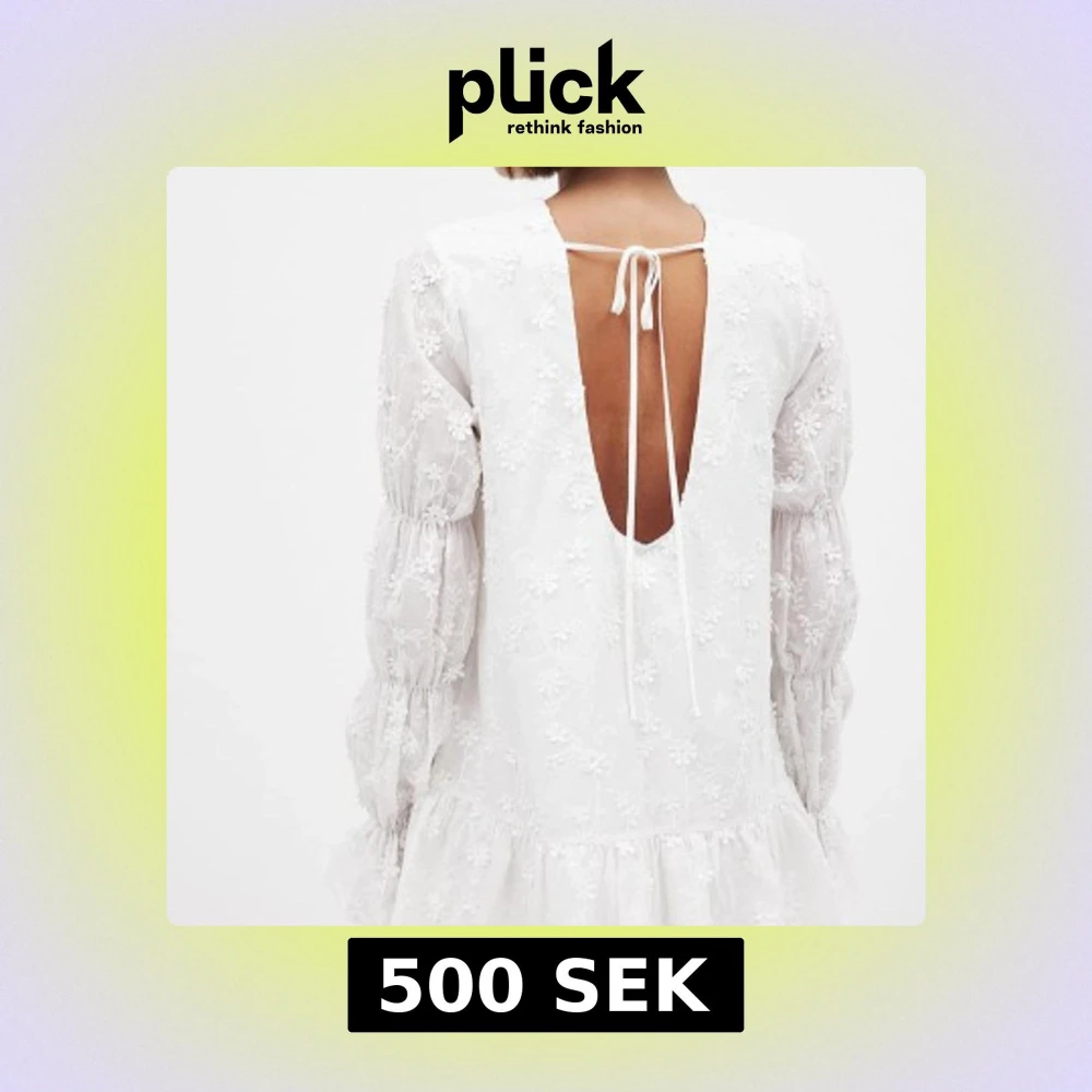 Superfin vit klänning från NA-KD med broderade blommor och volangdetaljer. Klänningen har långärmade puffärmar, öppen rygg med knytband och en flowy passform. Perfekt för sommarens alla tillfällen!