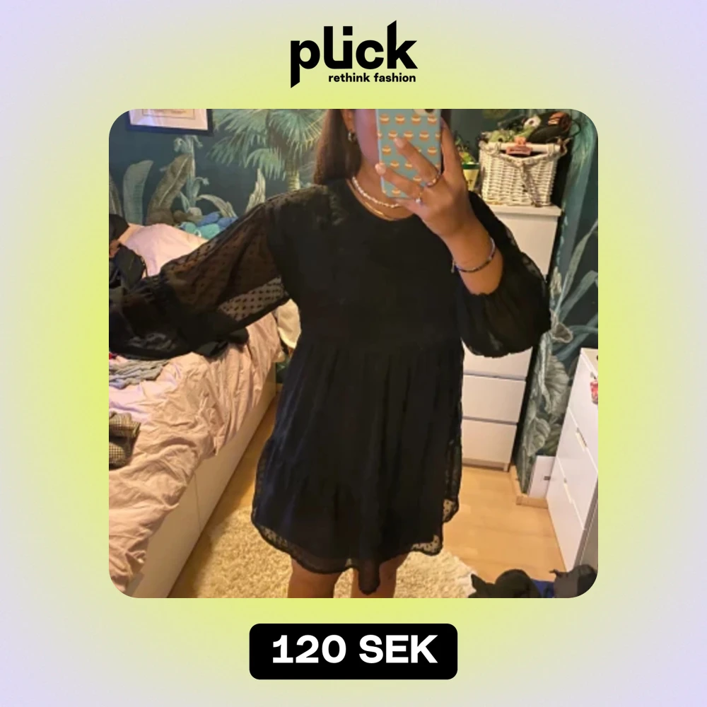 Så gullig svart långärmad kortklänning. Genomskinliga ärmar men resten är inte det. Luftig och skön, inte allt för kort. Jag änvände den mycket som kontorsklänning. Hög i kragen och en knapp man knäpper på baksidan. Små prickar i tyget.