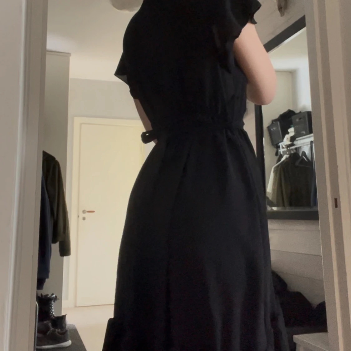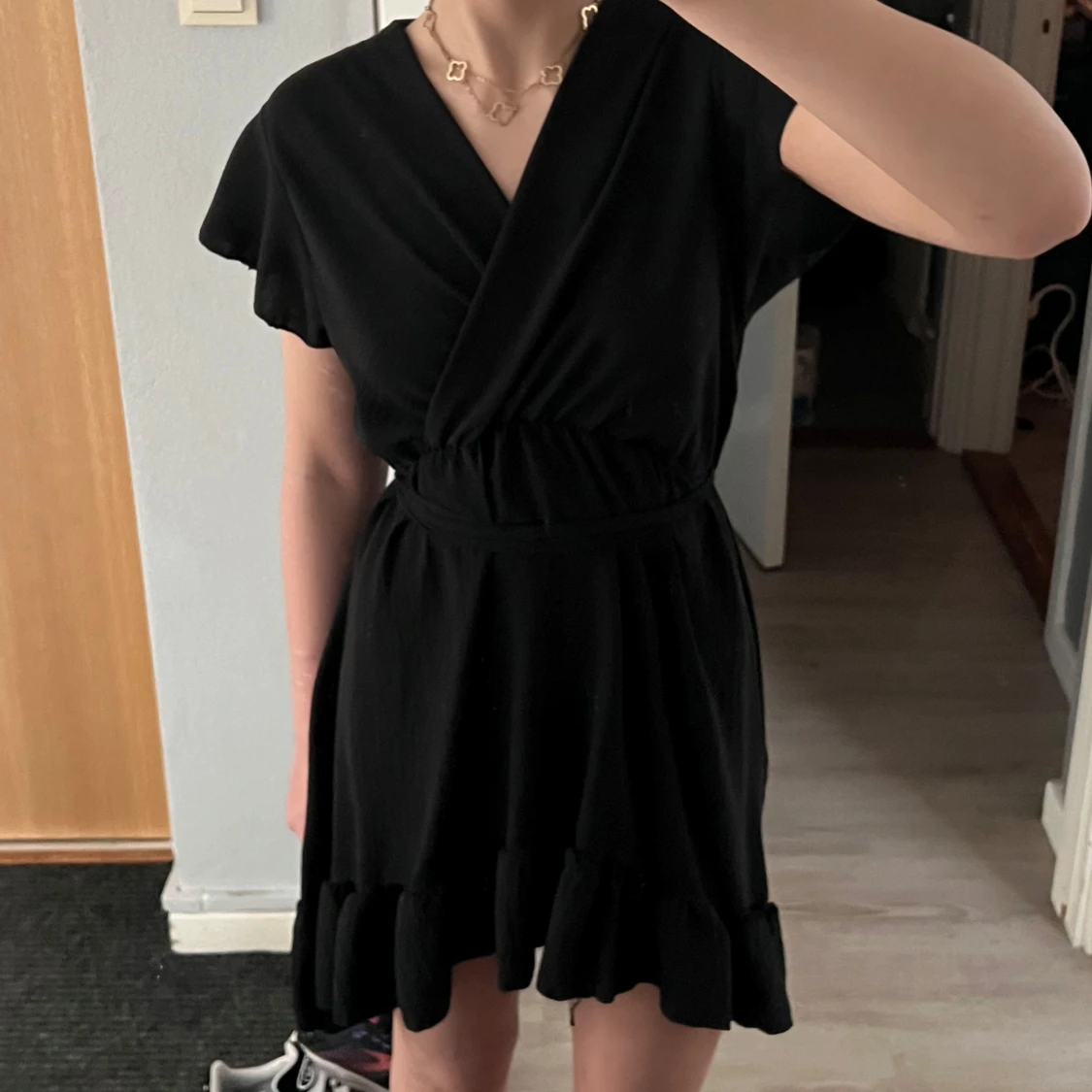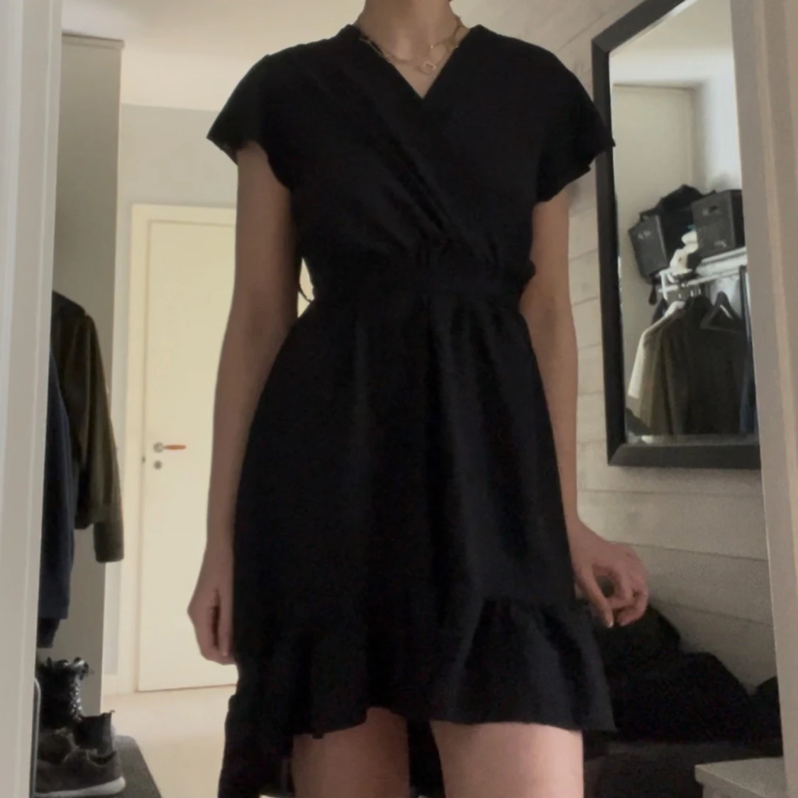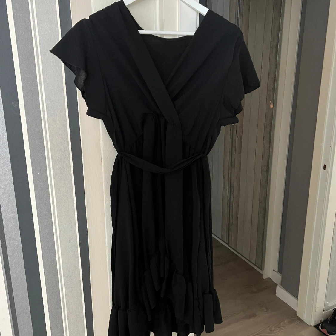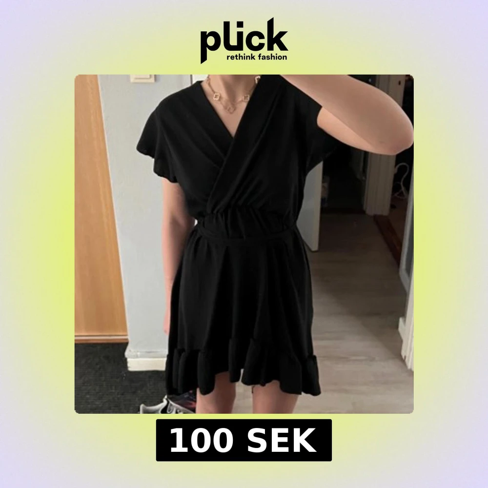 Snygg svart omlottklänning med korta ärmar och volangdetaljer vid fållen. Klänningen har en v-ringad design och ett knytband i midjan för en smickrande passform. Perfekt för en stilren look. One size i storleken men jag uppskattar att den skulle passa allt från XS - L med hjälp av bandet, jag har oftast storlek S!