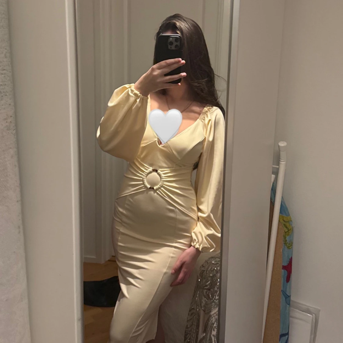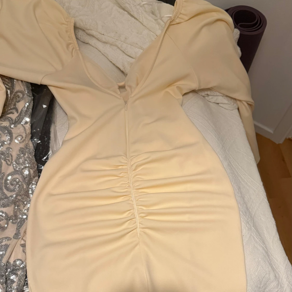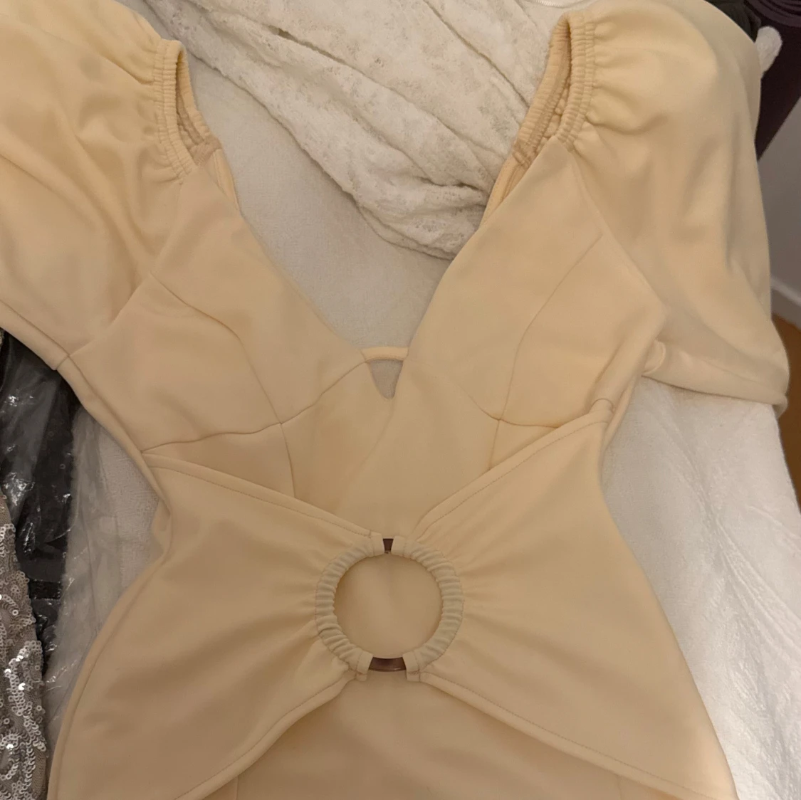 Elegant champagne/beige färgad figurnära klänning med en unik ringdetalj i midjan. Har även scrunch på bakdelen som ger en väldigt fin och smickrande look✨Helt oanvänd
