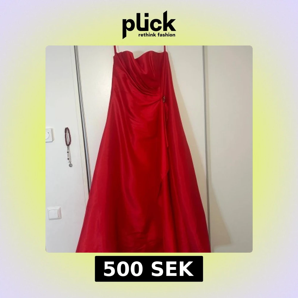 Elegant röd långklänning utan axlar och en vacker drapering framtill. Klänningen har en dekorativ broschdetalj och knappar längs ryggen. Perfekt för speciella tillfällen. Storlek L-XL