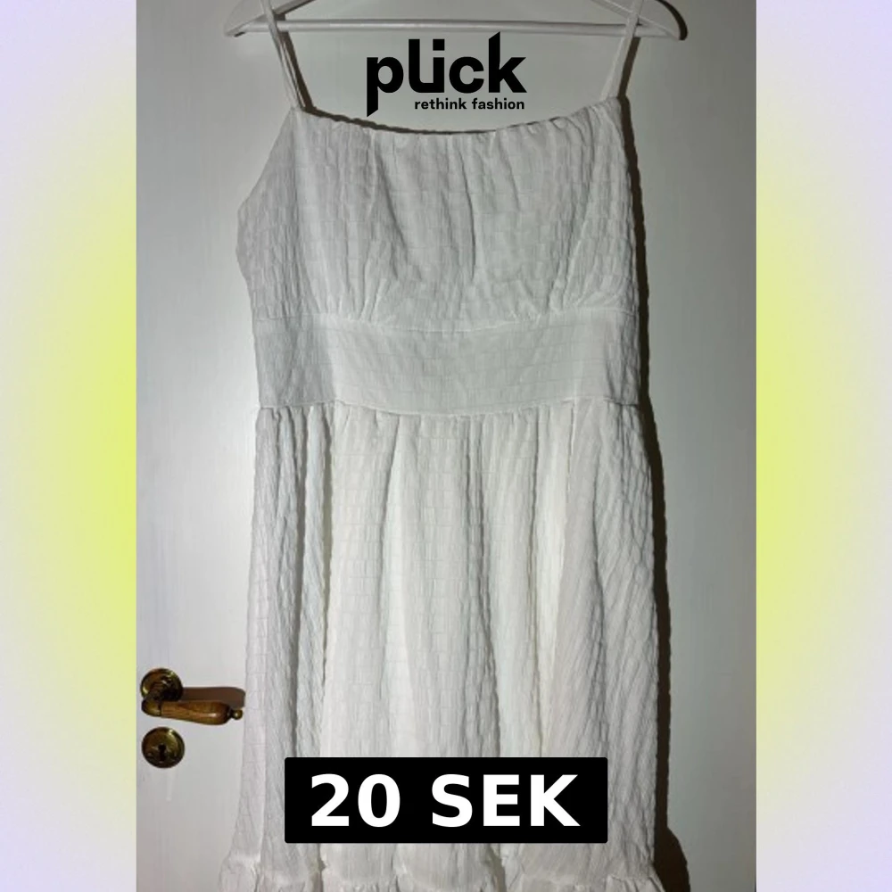 Söt vit klänning med smala axelband och volangkant nertill. Tillverkad i ett lätt, strukturerat tyg som ger en luftig känsla. Perfekt för varma dagar och enkel att styla med accessoarer.