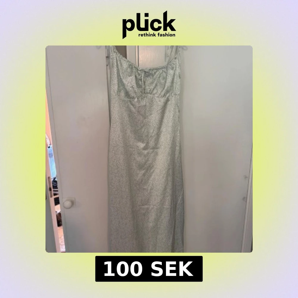 Superfin långklänning i ljusgrönt siden tyg med små vita blommor och rosa prickar. Klänningen har smala axelband och söt knytning framtill vid bysten so ger milkmaid modell. Perfekt flowy modell för varma dagar och somriga vibes.
