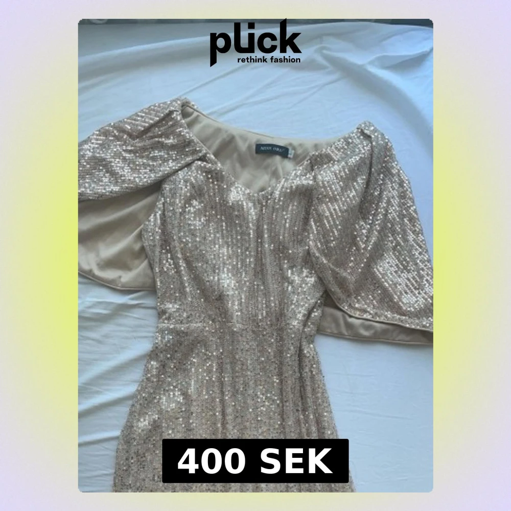 Säljer en glittrig långklänning från Miss Ord i champagnefärg med paljetter över hela klänningen. Klänningen har v-ringning och vida, korta ärmar som ger en elegant look. Perfekt för dig som vill sticka ut på festen!
