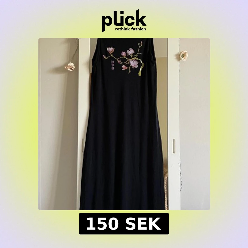 Svart ärmlös långklänning med ett fint blommigt tryck i lila och grönt framtill vid bröstet. Klänningen har en rak och enkel passform och är perfekt för en stilren look. Materialet känns mjukt och följsamt.