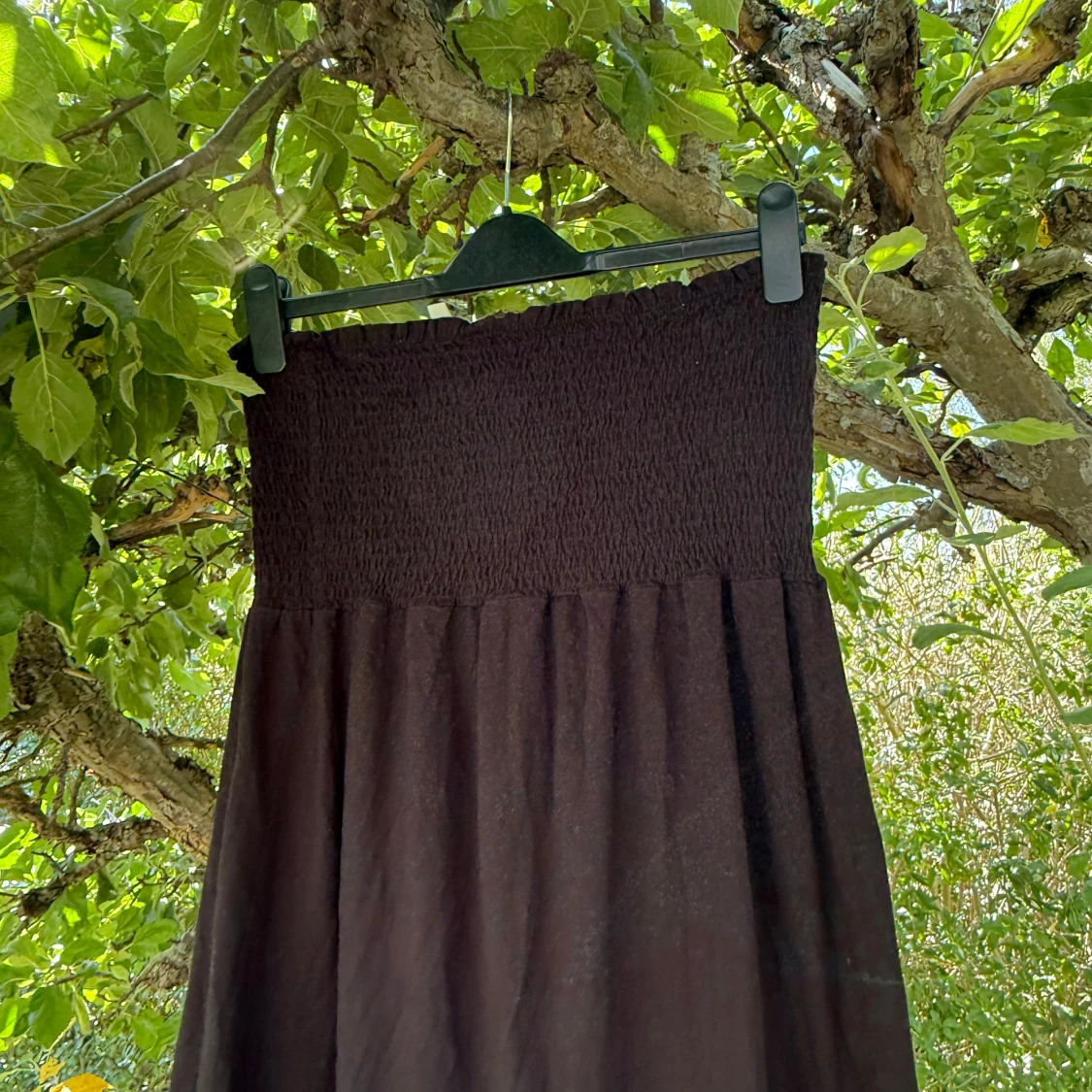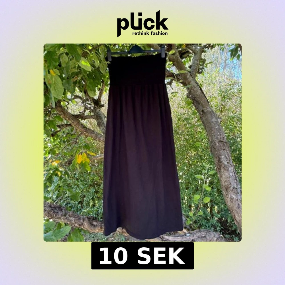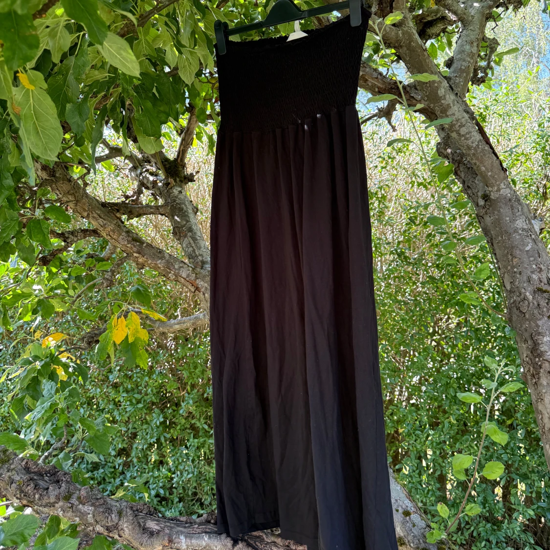 Svart långklänning från H&M Mama med smock upptill och rak, luftig kjol. Klänningen är axelbandslös och har en enkel, stilren design som passar perfekt för varma dagar. Materialet är mjukt och känns skönt mot huden. Snygg att styla med sneakers eller sandaler. Storlek M, men passar en L. Fint skick, men fortfarande mycket kvar att ge.