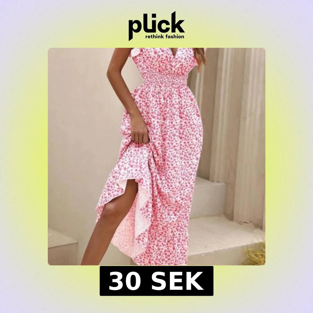 Klänningen går ner till vaderna, resårband i midjan och lätt utsvängd nertill 💗 klänningen är vit med rosa blommor och smala volanger på ärmen. Den är tunn så väldigt skön på sommaren, dock inte kommit till användning här hemma 💗