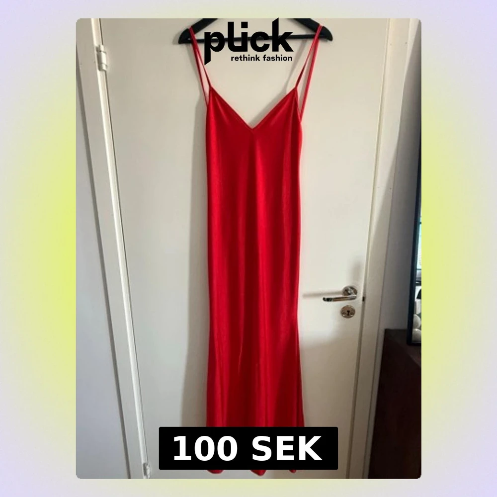 Säljer en röd långklänning med smala axelband och v-ringning både fram och bak. Klänningen har en enkel, elegant design och är lätt utsvängd nertill. Materialet ser ut att vara mjukt och följsamt, perfekt för sommarens varma dagar.