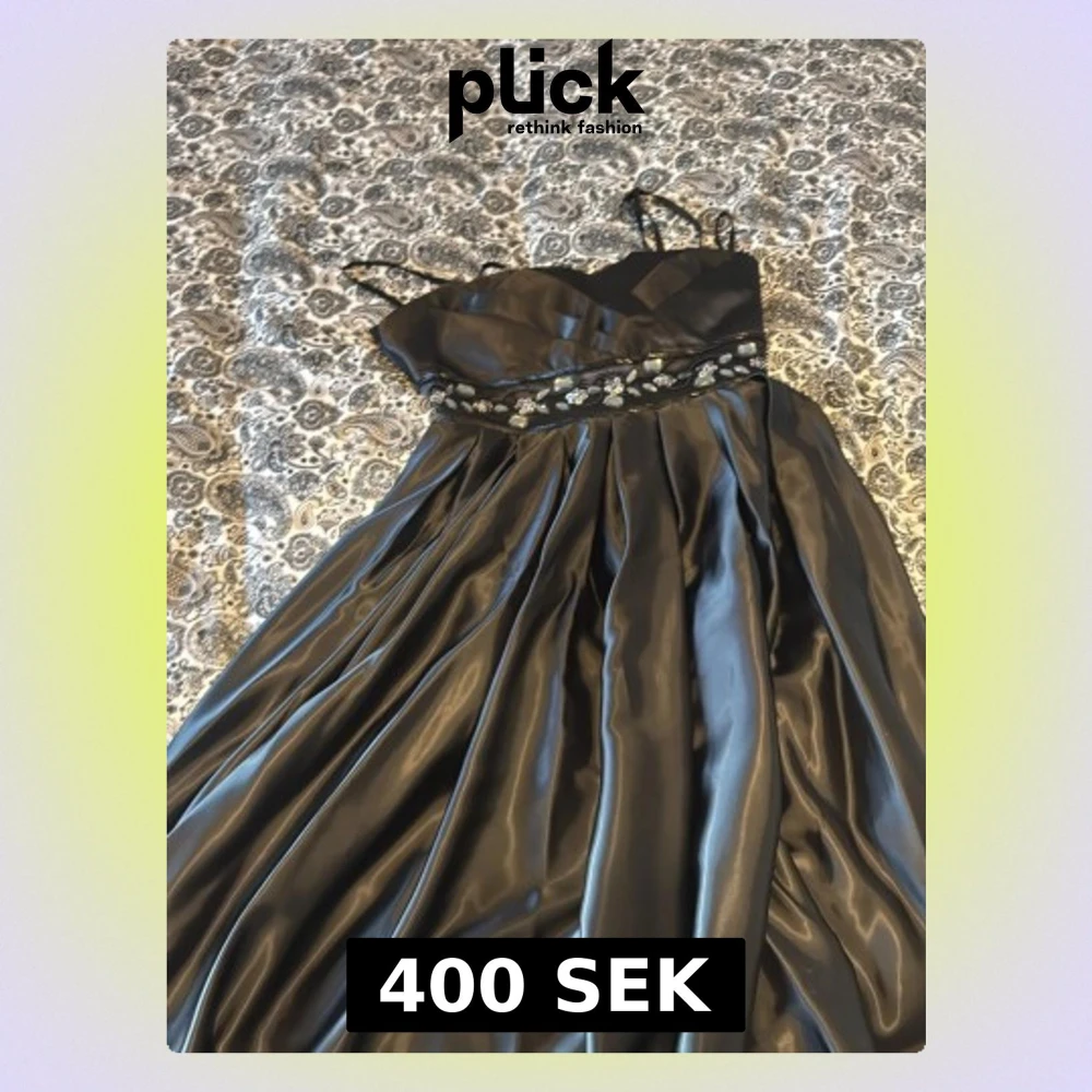 Elegant svart långklänning med smala axelband och v-ringad överdel. Klänningen har ett glansigt satinliknande material och ett brett midjeband dekorerat med broderade blommor i silver och vitt. Perfekt för speciella tillfällen.