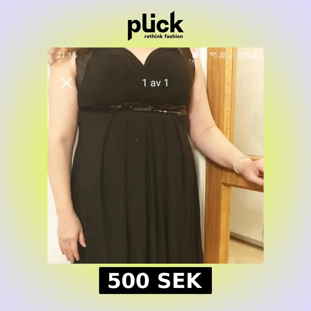 Elegant svart klänning med v-ringad hals och ett smalt bälte i midjan. Klänningen har en klassisk och tidlös design som passar perfekt för festliga tillfällen.