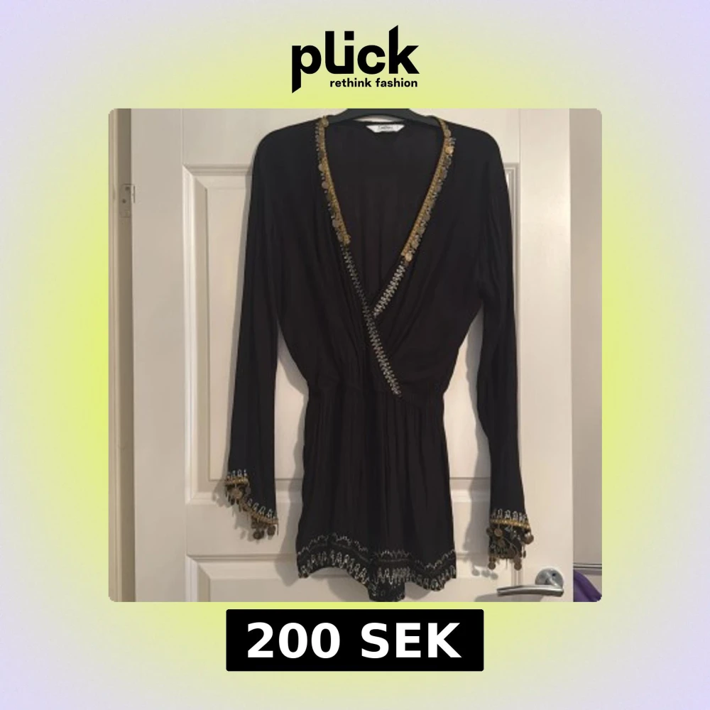 Svart kortklänning med v-ringning och långa ärmar. Klänningen har guldfärgade och silvriga detaljer längs halsringning, ärmslut och nederkant. Tunn och luftig med markerad midja och dekorativa myntdetaljer som ger en unik look.