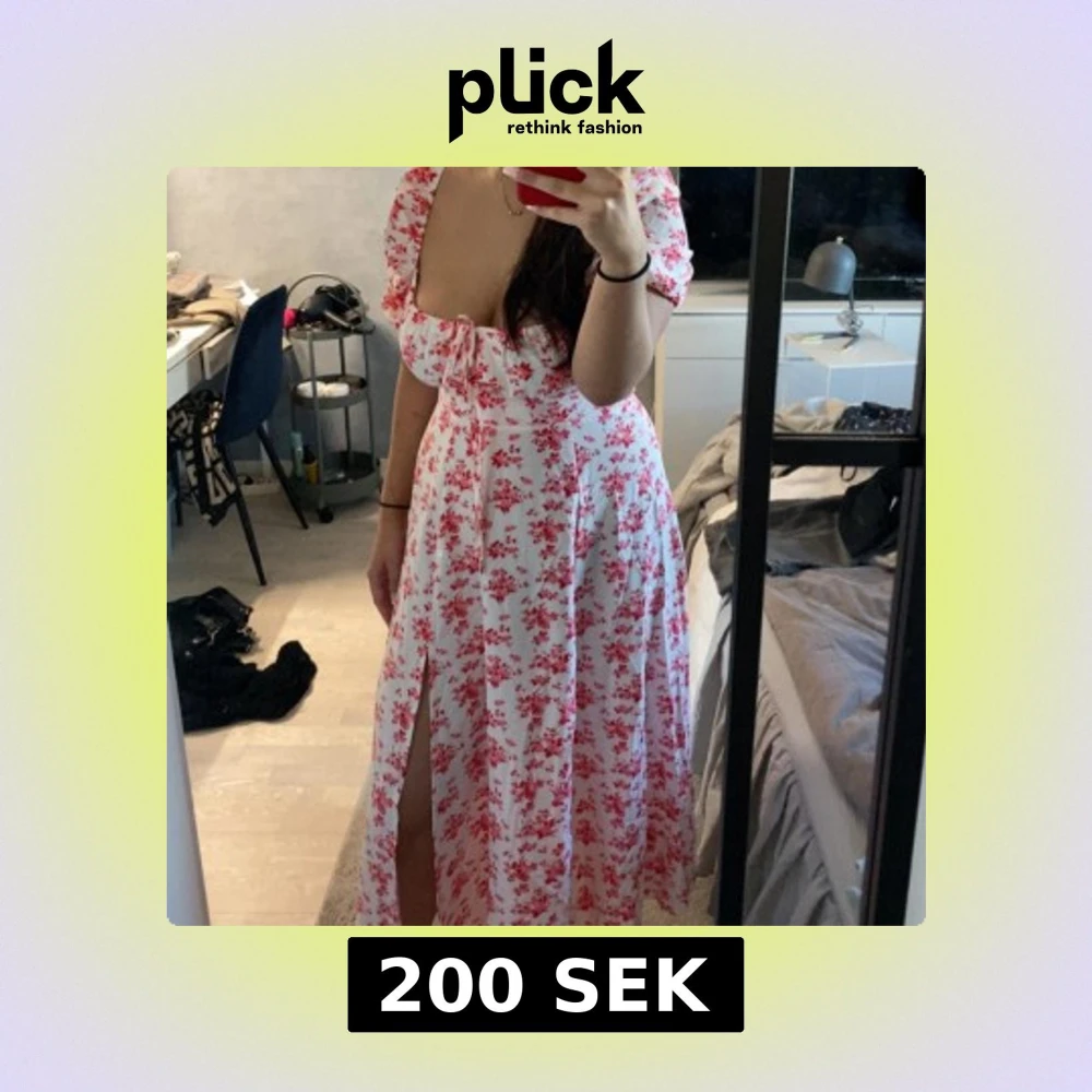 Charmig vit långklänning med rosa blommönster och en djup v-ringning. Klänningen har korta ärmar och en elegant slits framtill. Perfekt för somriga dagar och speciella tillfällen.