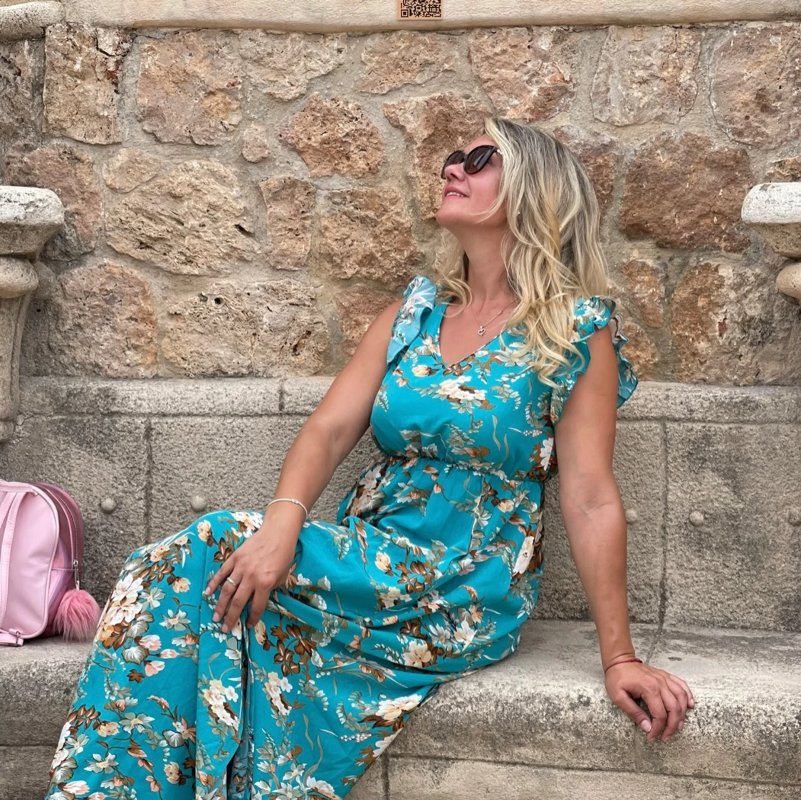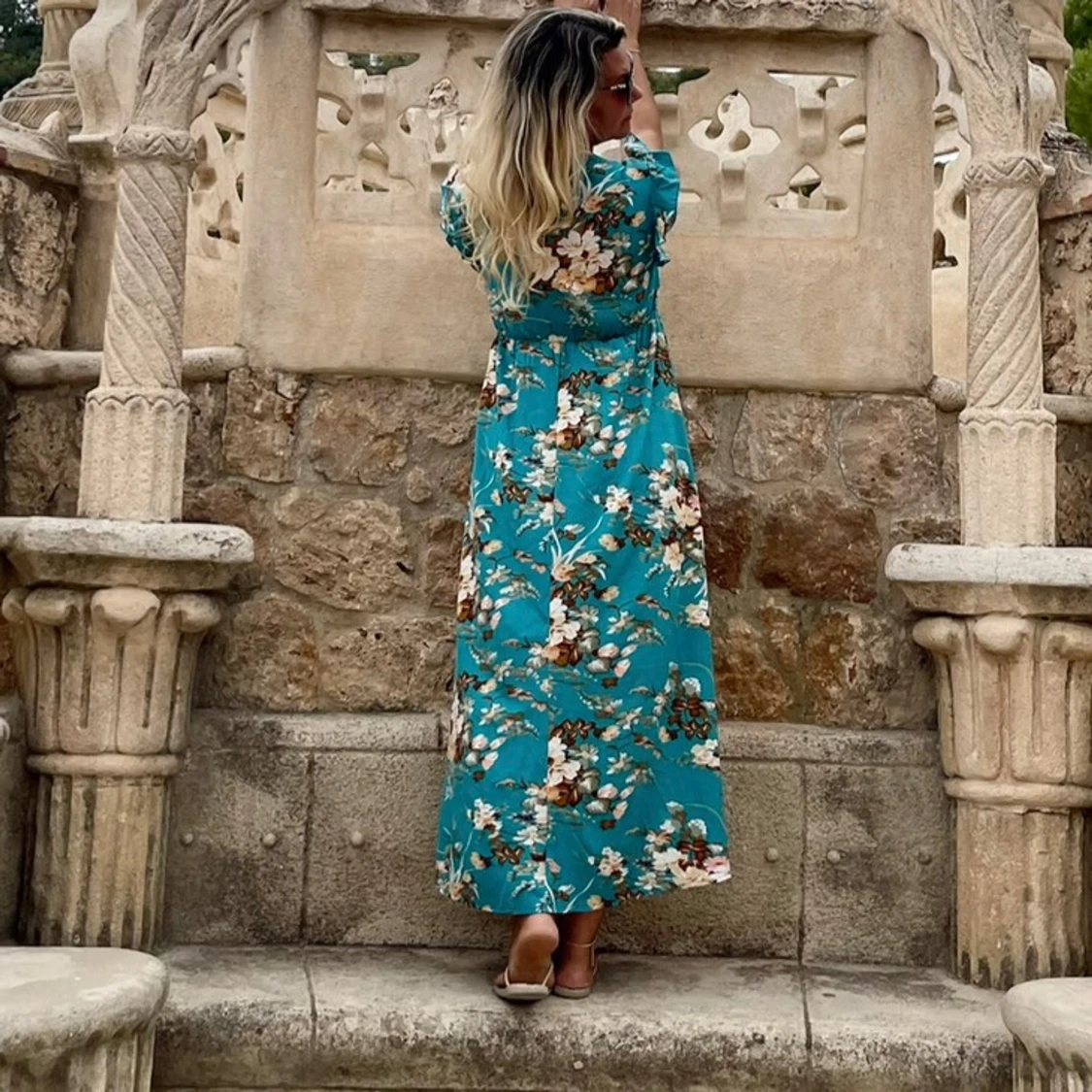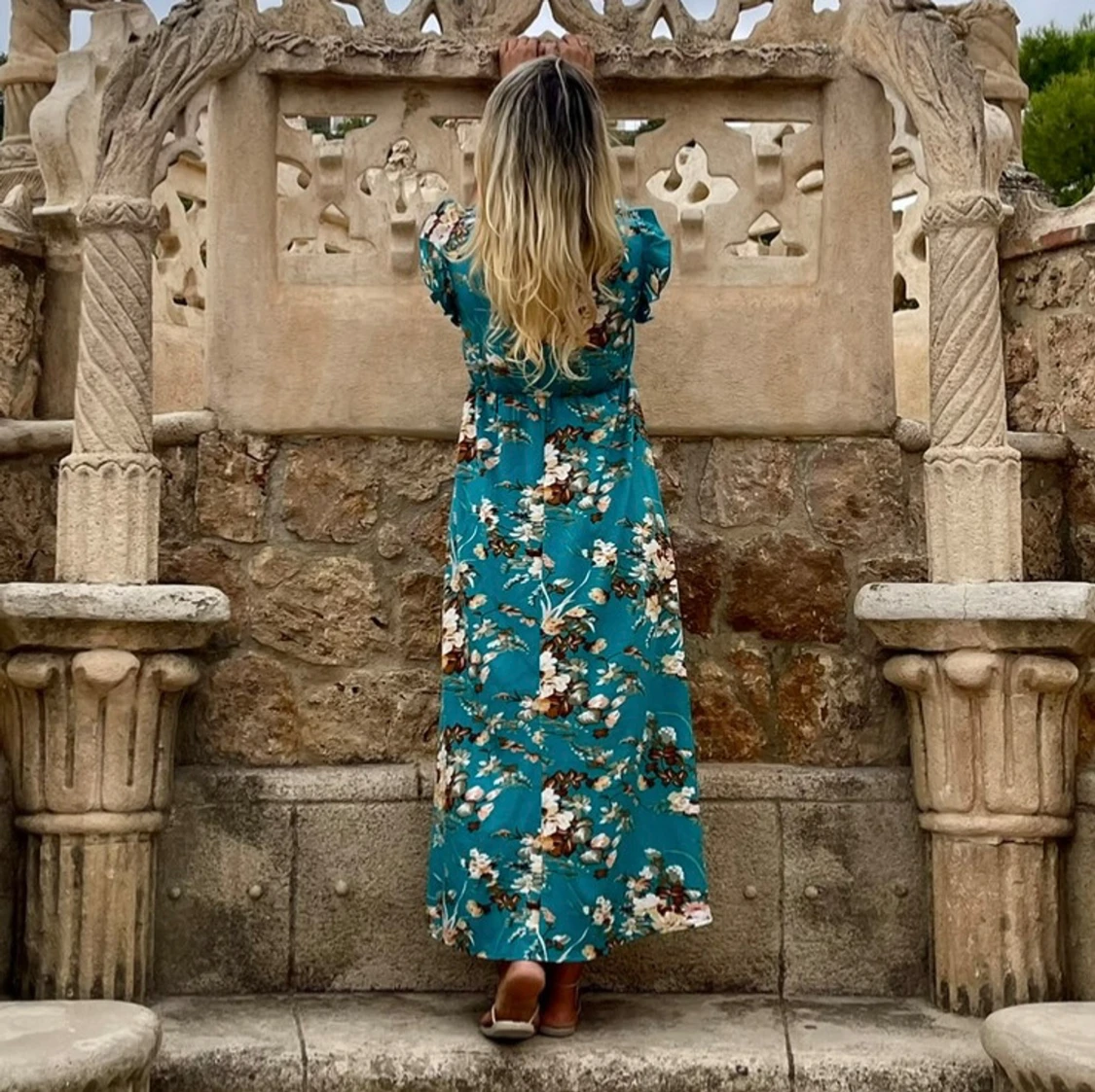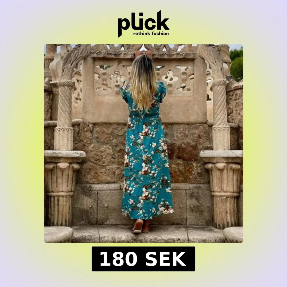 Turkos blommig långklänning med volang