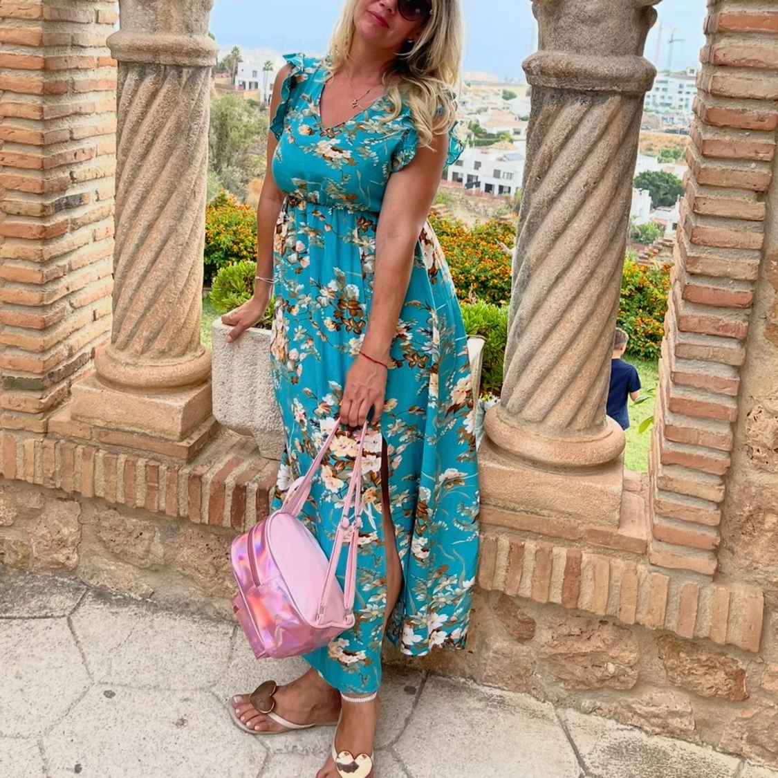 Superfin turkos långklänning med blommigt mönster i vitt och brunt. Klänningen har v-ringning, volangdetaljer vid axlarna och är ärmlös. Den har en markerad midja och ett luftigt fall, perfekt för varma dagar.Använd bara en gång Storlek passar både M och L