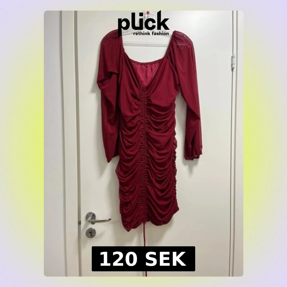 Säljer en vinröd kort klänning med lång ärm och snygg v-ringning. Klänningen har rynkade detaljer längs hela framsidan och snörning nedtill för att justera längden. Materialet känns lätt och har en mjuk finish.