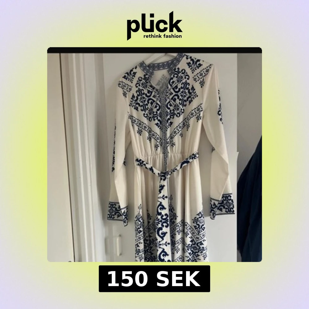 Långklänning i vit med marinblått mönster och knytband i midjan. Klänningen har lång ärm, rundad halsringning och detaljerade blå mönster längs ärmslut, midja och nederkant. Perfekt för dig som gillar bohemisk och stilren look. Och perfekt för hijabi kvinnor. Den är helt ny