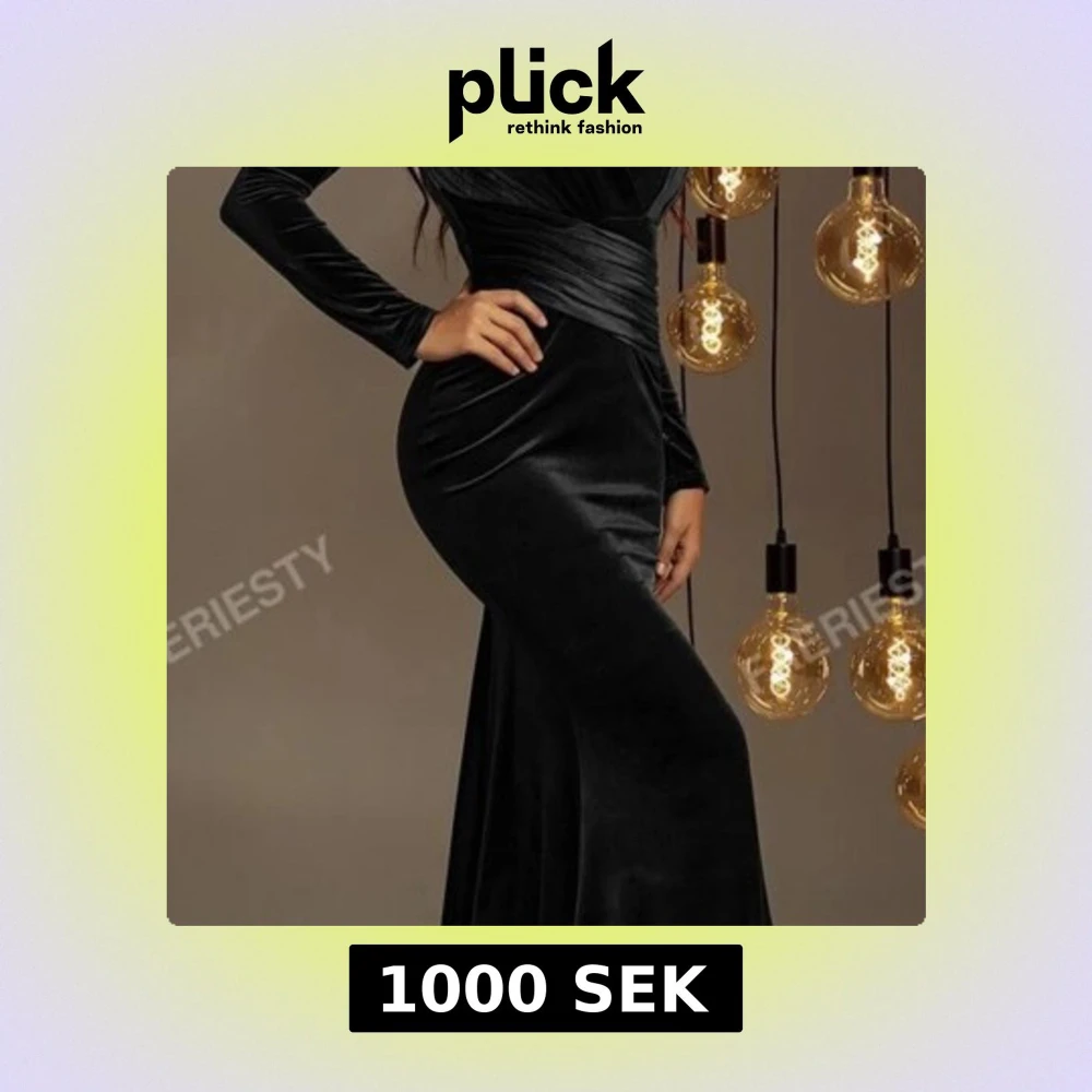 Elegant svart långklänning i sammet med omlott-design och långa ärmar. Klänningen har en figurnära passform och en v-ringad halslinje som ger en sofistikerad look. Festklänning helt ny aldrig använt storlek L