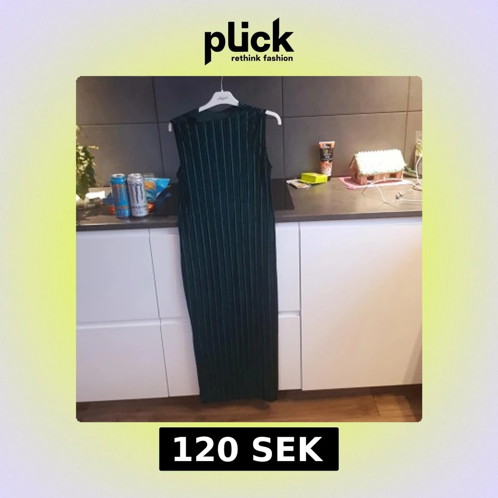 Elegant grön långklänning med vertikala ränder. Klänningen är ärmlös och har en stilren design som passar perfekt för festliga tillfällen. Materialet ser ut att vara mjukt och följsamt. Är plisserad.